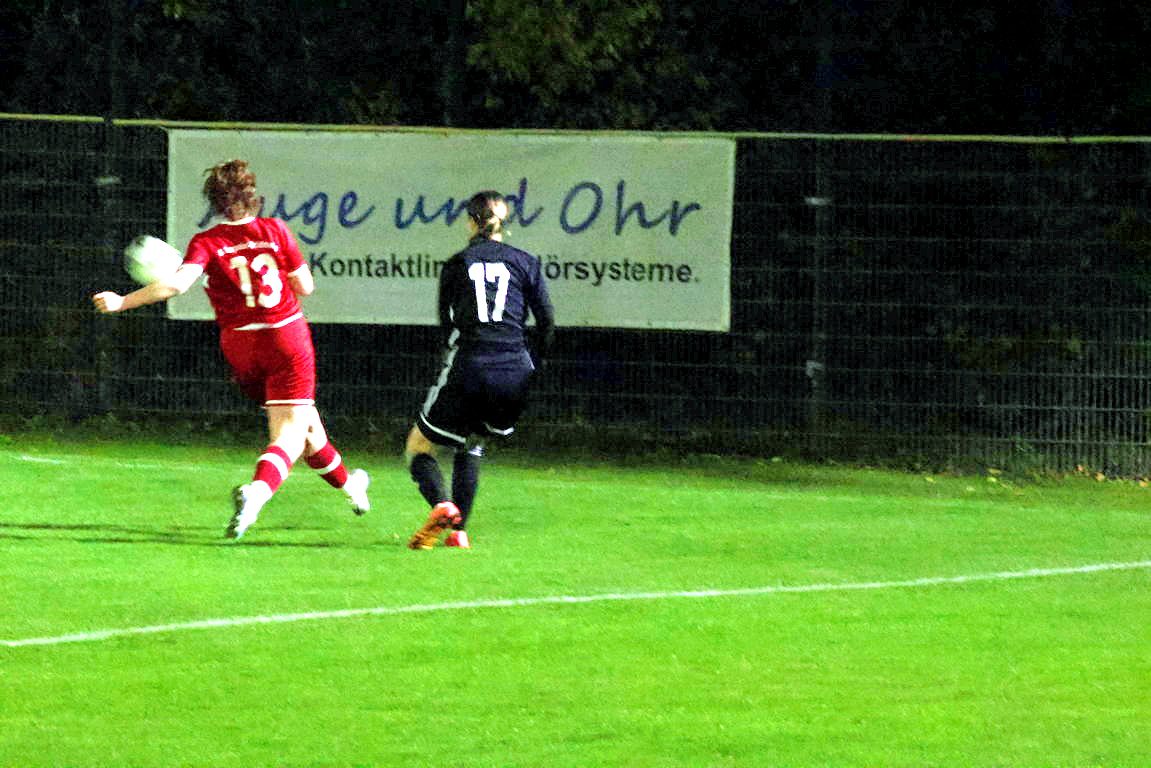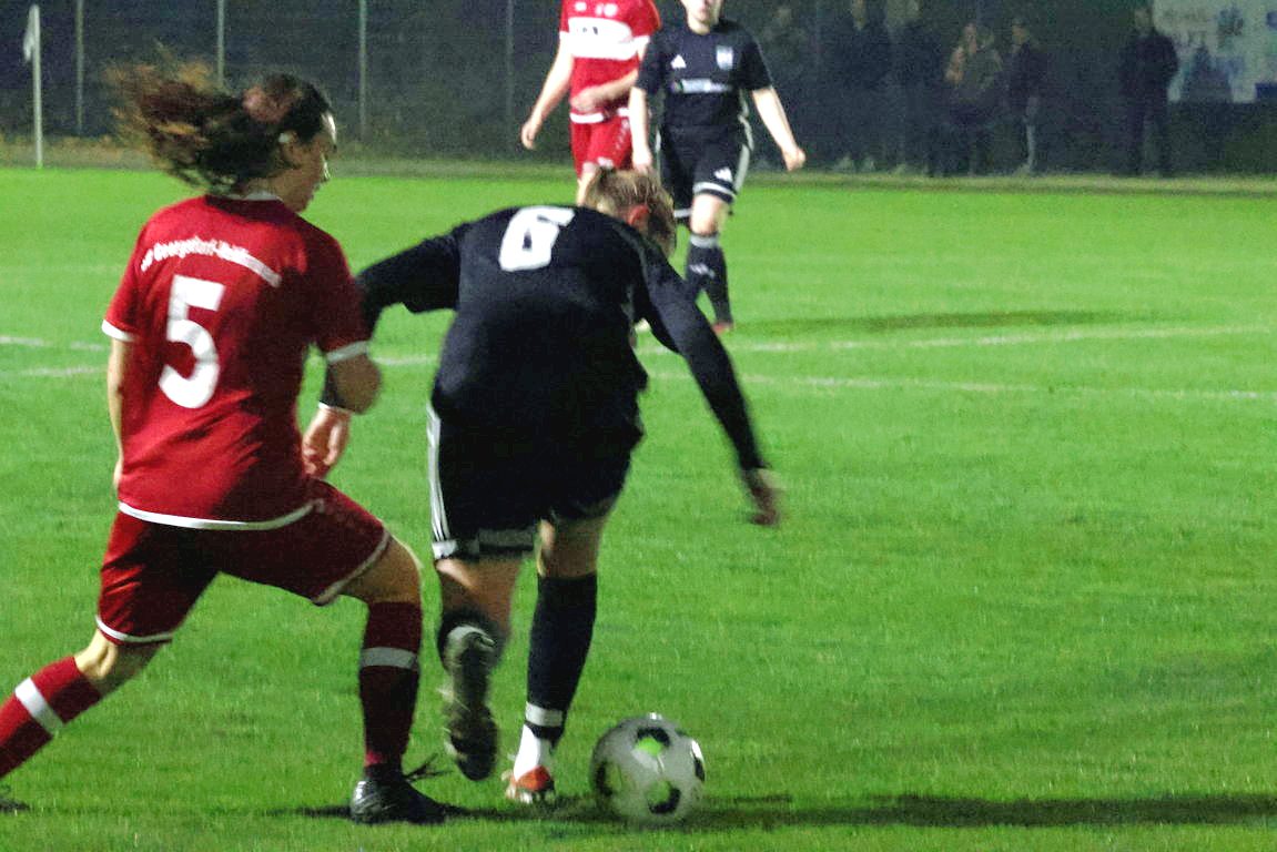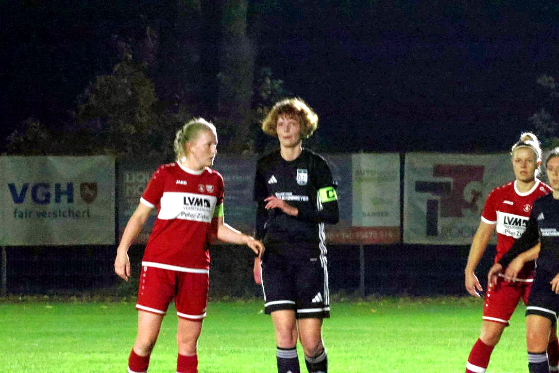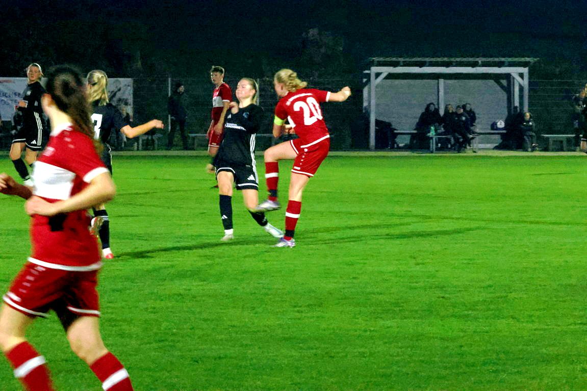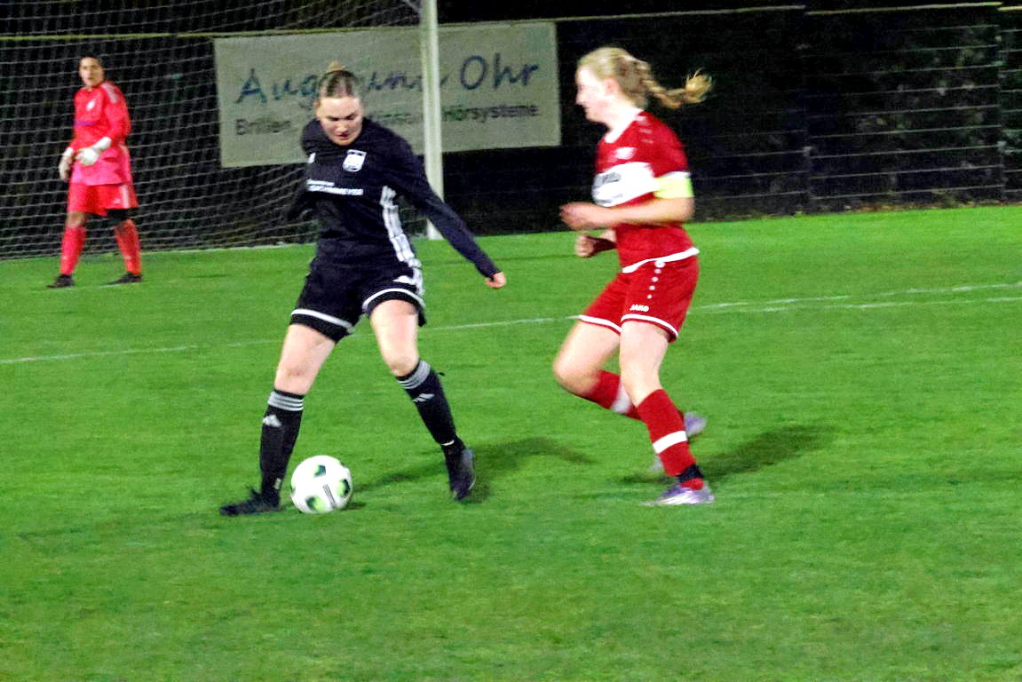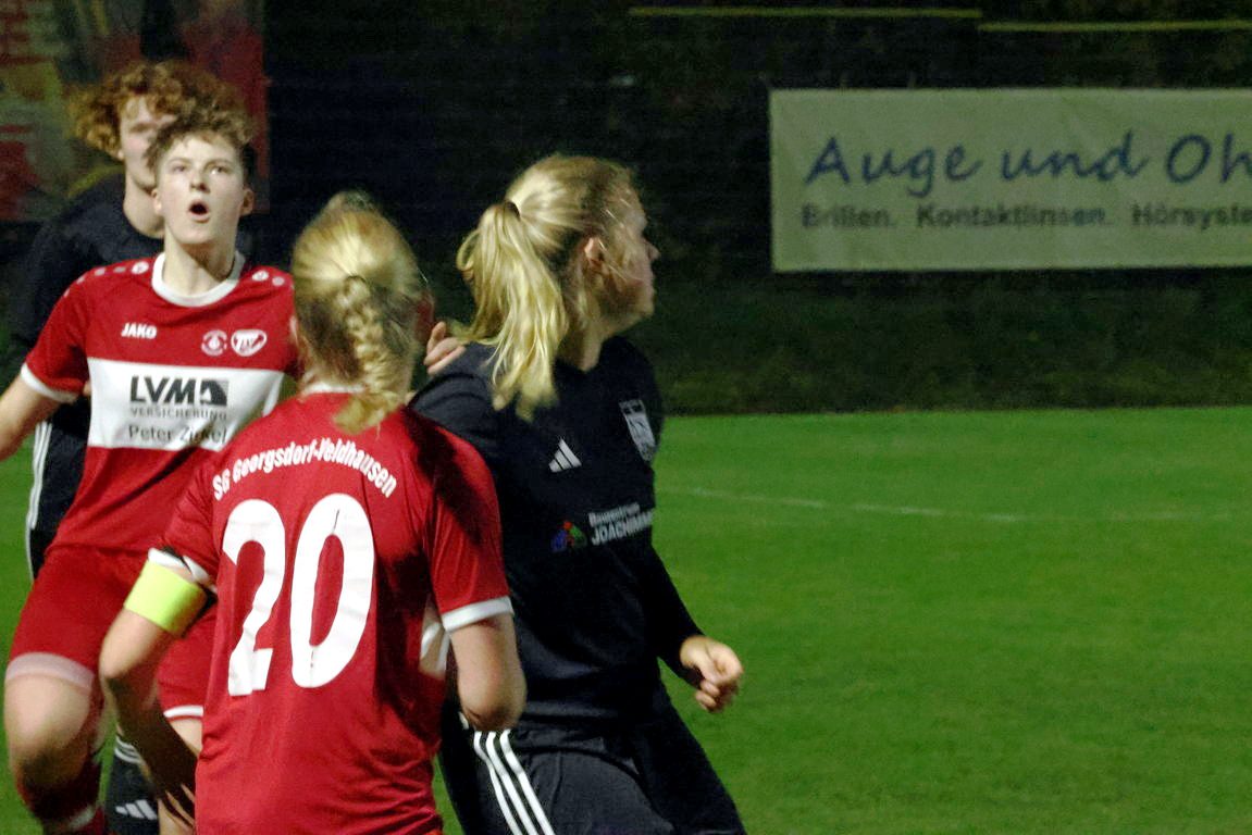 Von Beginn an entwickelte sich eine intensive Partie, mit der 1. Torannäherung durch die Gastgeberinnen in persona Lou Schröder. Doch sukzessive kamen auch die Gäste entsprechend in die Partie. Deren 1. halbwegs gefährliche Torchance verbuchten sie in Minute 14 durch einen Torschuss von Rieke Klokkers, der 0,5m über den Querbalken zischte. Was das Halali für das Offensivspiel der SG Georgsdorf darstellte, die sich im weiteren mehr und mehr dem 0:1 annäherten. Doch die Gäste scheiterten immer wieder entweder am eigenen Unvermögen, oder der vielbeinigen, kämpferisch perfekt eingestellten SG BOS-Abwehr. So blieb es bis zum Pausenpfiff des souveränen Schiedsrichters Sebastian Welkener vom SC Melle 03 torlos. Es war bis dahin eine sehr zweikampfintensive Angelegenheit, ohne aber die ganz großen Offensiv-Highlights, trotzdem für die etwa 35 Besucher sehr unterhaltsam. Vorteile für die Gäste zwar ja, aber die Gastgeberinnen hielten nichtsdestotrotz die Null.