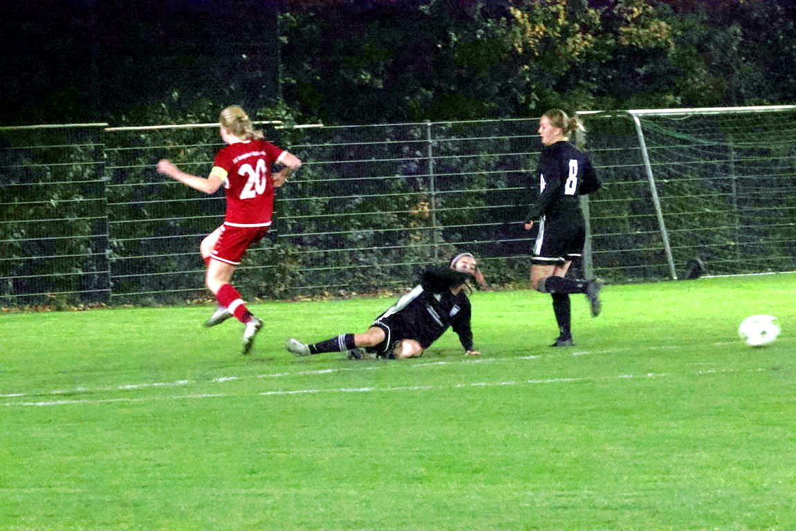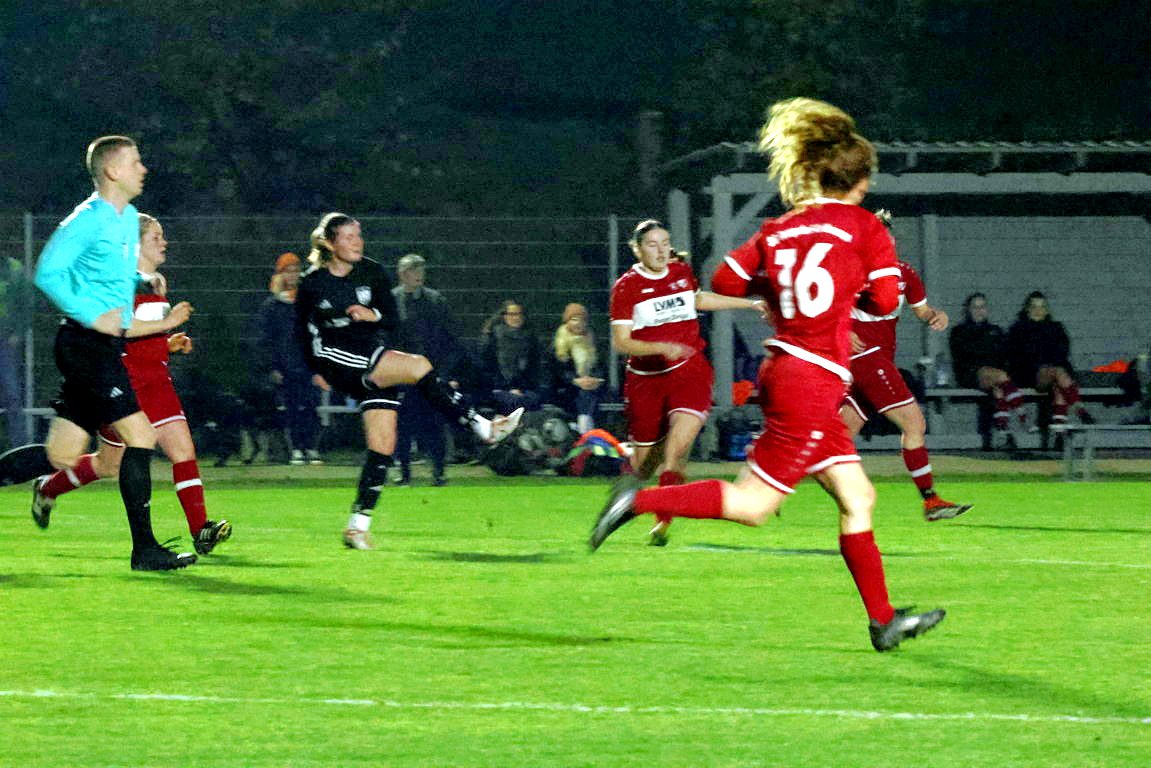 So begann Durchgang 2 mit, zu dem Zeitpunkt, nicht unüblichen Wechseln. Und nach wenigen Minuten führte plötzlich die SG BOS, einem Treffer den sich die Kuhlmann-Elf aufgrund ihrer hervorragenden Einstellung irgendwo auch verdient hatte. Minute 51, perfekt getimter Steckpass aus der Zentrale in den Strafraum von Elisa Kruckemeyer, der die komplette Gäste-Abwehr blank stellte. Lena Piening, nach perfektem Laufweg, stand dadurch völlig frei vor der SG GVE-Torfrau, und vollstreckte mühelos aus 6m. Würde dieses 1:0 dem Spiel jetzt nochmal eine extra Portion Würze geben? Ja, tat es. Denn 4 Minuten nach dem 1:0 schlugen die sicherlich favorisierten Gäste bereits zurück. Ecke, die von der SG BOS nicht geklärt werden konnte, Kopfballablage 7m vor dem Tor auf Anna Frese, die aus der Zentrale einnickte. Das Tempo im Spiel wurde immer höher, es ging rauf und runter, doch die SG BOS I wich weiter kaum von ihrer disziplinierten Defensiv-Linie ab, hielt den Tabellen-2. weiter größtenteils in Schach, und hatte den einen oder anderen Nadelstich im Programm. Wirklich tolles Spiel auf beiden Seiten bis hierhin. Dann jedoch Minute 72, und einer Aktion, die möglicherweise als Knackpunkt des Spiels erachtet werden könnte. Eine Angreiferin der SG GVE lief alleine auf das von Anna-Lena Schlüter hervorragend gehütete BOS-Gehäuse zu, Lena Blume, mit allem was ging, hinterher. 2 Meter vorm Strafraum setzte sie zur Grätsche an, und traf die GVE-Angreiferin, die zu Fall kam. Eine Aktion, die man durchaus als Notbremse auslegen konnte, die SR Welkener auch mit der Roten Karte bestrafte. Da es gegen diese Entscheidung auch kaum Proteste aus dem BOS-Lager gab, konnte man also mit Glatt Rot konform gehen. Nun war für die Kuhlmann-Elf guter Rat teuer, eine Abwehrsäule weg, in Unterzahl, ohjeohje. Doch der Rückgrat des Teams blieb enorm. Teilweise auf der letzten Rille verteidigte man weiter, so gut es ging, alles weg. Doch in Minute 79 konnte man den Rückstand doch nicht mehr verhindern. Flanke von der rechten Seite, Moya Brinkman stand völlig blank am 5er, scheiterte mit ihrer Direktabnahme zunächst an der Latte, den Abpraller daraus brachte sie aber im Netz unter, 1:2. Mit allen Tricks und Kniffen versuchten die Gastgeberinnen nun verzweifelt, hier noch an irgendwie etwas Zählbares zu gelangen, doch die Verhältnisse hatten sich jetzt natürlich gedreht, Angriff um Angriff rollte auf das BOS-Gehäuse zu. Die Gäste wollten die Entscheidung. Und die Entscheidung dann mit Anbruch der Nachspielzeit. Rieke Klokkers legte zentral im Strafraum ab auf Moya Brinkman, die ihre freie Schussposition aus 7m veredelte, 1:3. Der Deckel war somit drauf, und kurz danach pfiff SR Welkener ab.