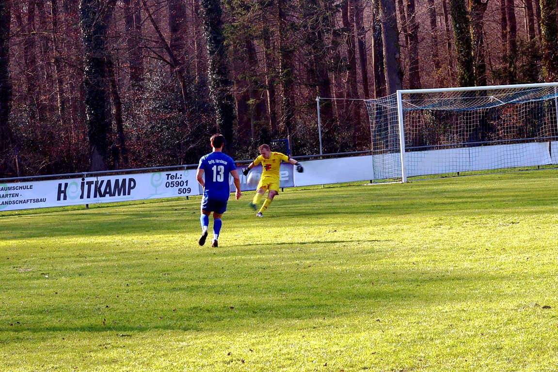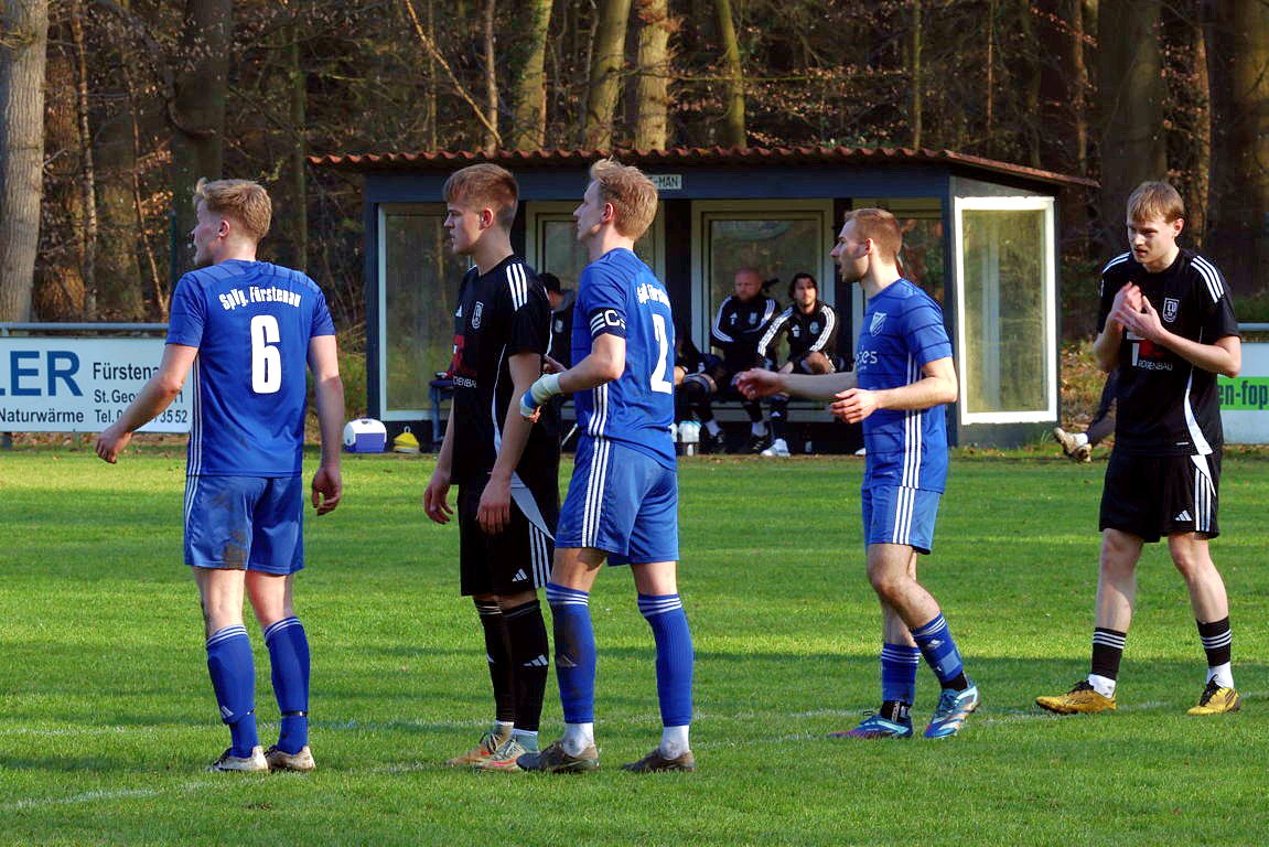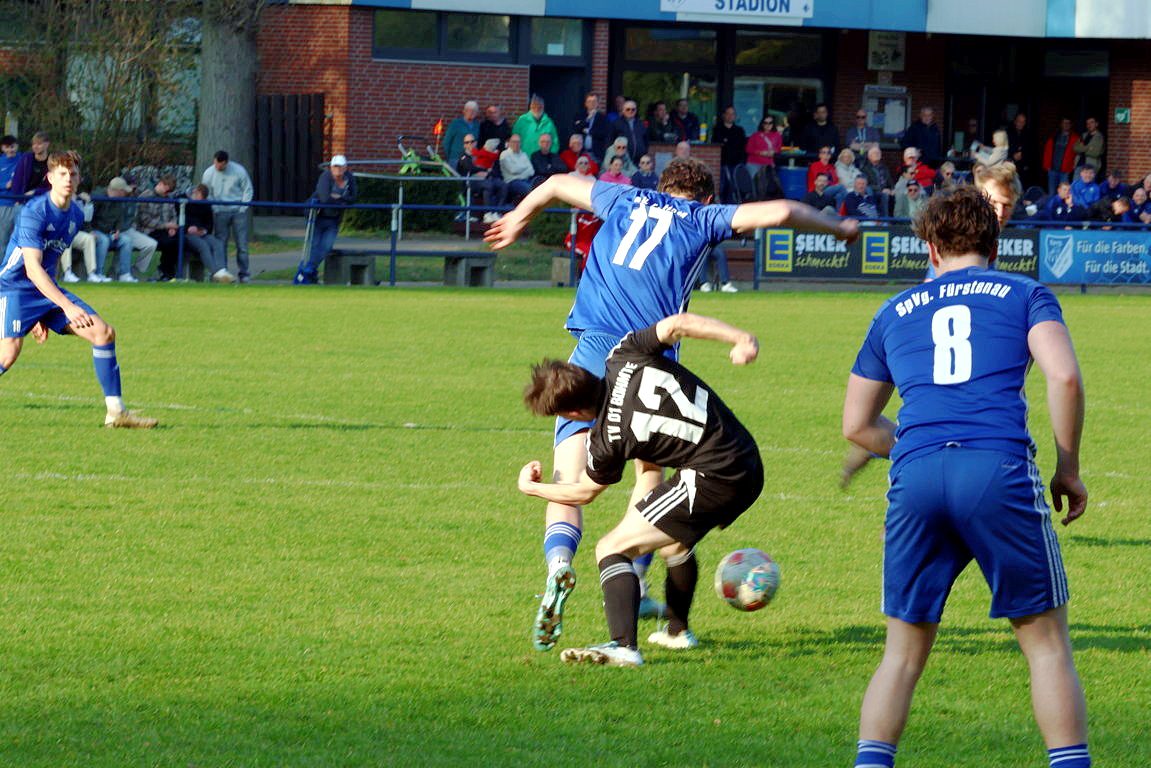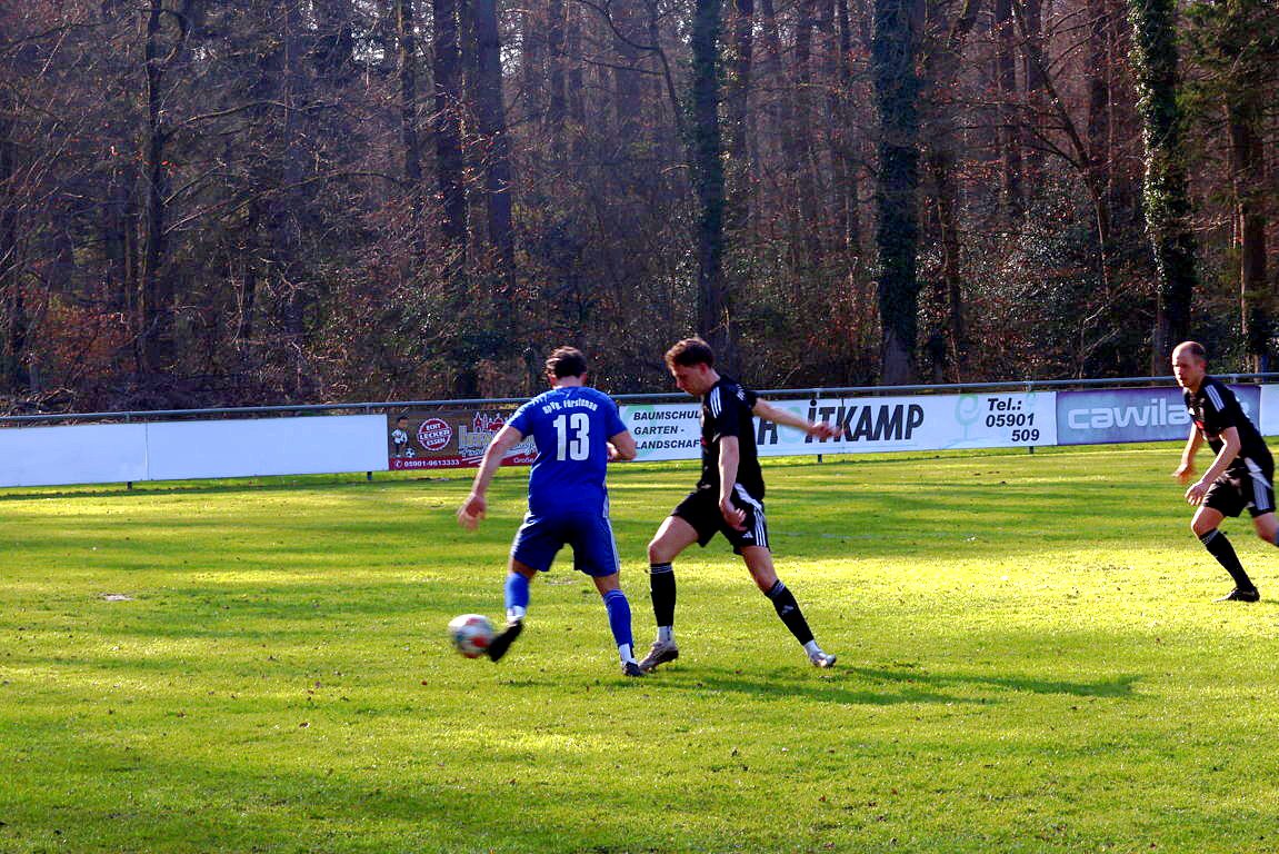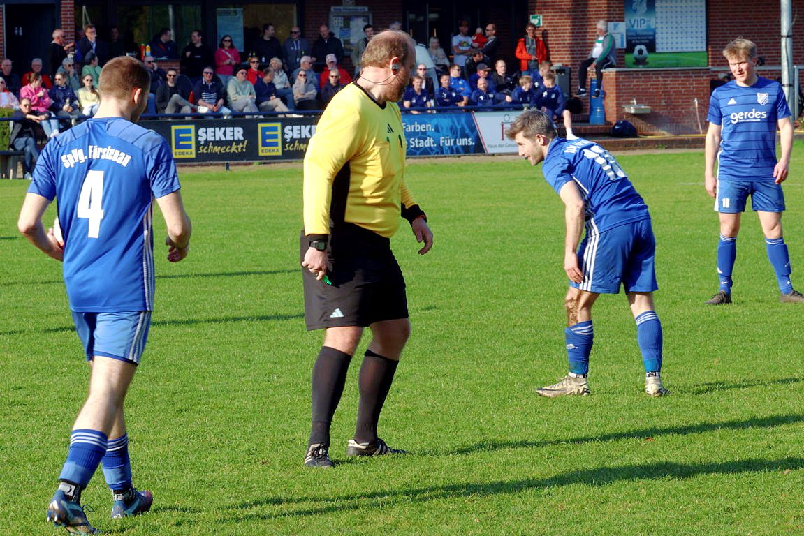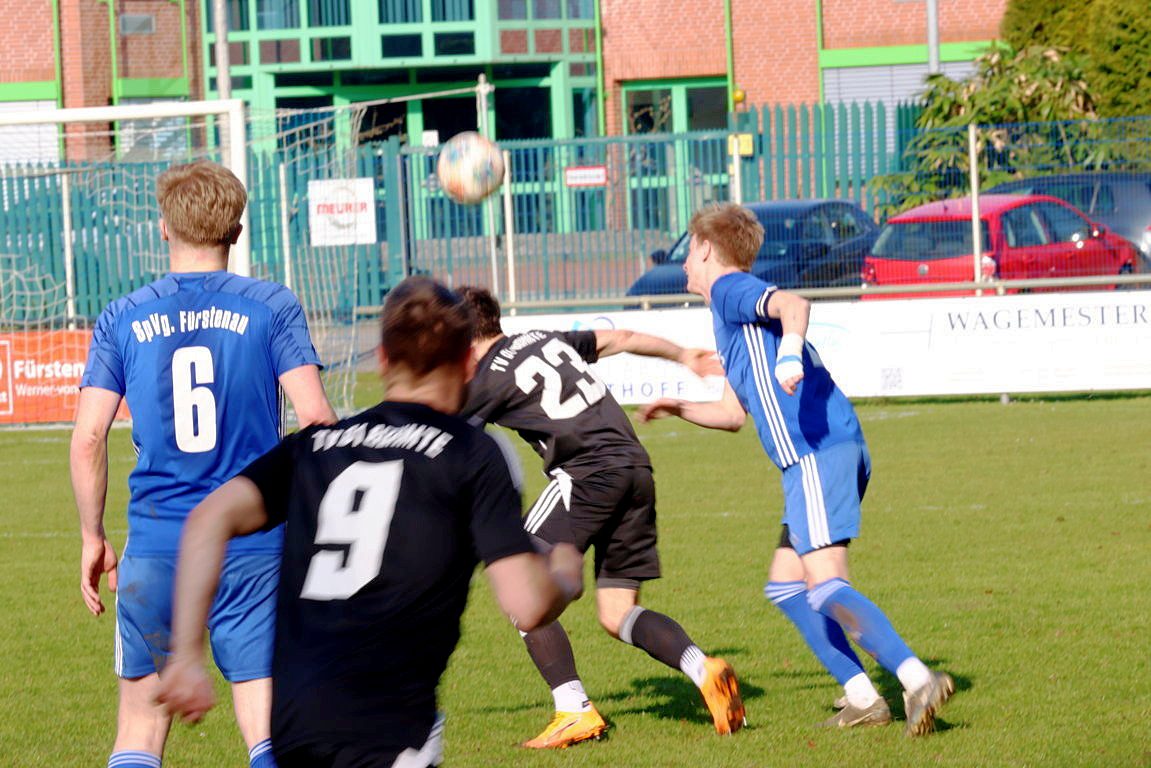 Bohmte kam von Anpfiff an überhaupt nicht in Tritt, wirkte kraftlos und phlegmatisch, aber auch sehr fahrig in allen Aktionen. Den Gastgebern, mit einem 4:1-Auswärtssieg bei der SG Ostercappeln/Schwagstorf I angetreten, merkte man schon in Sekunde 1 an, das sie unbedingt die 0:4-Hinspielniederlage vergessen machen wollten, und der Konkurrenz in der Kreisliga ein Zeichen geben wollten, keinesfalls die Saison in irgendeiner Form abzuschenken o.ä. Völlig ging die Spvg. in Minute 8 in Führung. Ecke Max Baumtrog von links an den 5er, Jonas Büter stieg völlig unbedrängt hoch und nickte ein zum 1:0. Das konnte man besser verteidigen. Bohmte irgendwie noch komplett unsortiert im Defensivverbund, Fürstenau agierte sehr laufstark und körperbetont. Und das 2:0 ließ nicht lange auf sich warten. In Minute 12 gab es Foulelfmeter für die Elf von Coach Jan Meyer, und der ging auch völlig in Ordnung, nach klarem Foul an Maximilian Müncher. Julian Jäger trat zur Ausführung an, verlud Bohmtes TW Matthias Lange und verwandelte eiskalt links unten rein. Überraschend früh standen die Gäste nun also schon vor einem Riesen-Brett, aber Fürstenau sollte das auch weiterhin richtig gut machen. Man hoffte jedenfalls im Bohmter Lager auf einen schnellen Reset der Mannschaft, aber leider vergebens. Im Gegenteil. Bei 2 Großchancen in den Minuten 15 und 16 hatten Franz Lang und Julian Jäger, bei ähnlich gelagerter Chancen-Art, die Riesenmöglichkeiten nach einer Viertelstunde schon gar auf 4:0 zu stellen. So waren die ersten 20 Minuten rum, und Bohmte weiterhin komplett nicht da. Und noch mit etwas Glück, das die Gastgeber ihre Situationen manchenteils noch zu ungenau und unkonzentriert ausspielten. Viele Fehlpässe im Aufbau, die TV 01-Akteure wirkten angeknockt. Jeder 2. Pass zwischen beiden Halbfeldern geriet zum Fehlpass. So kamen die Wittlager überhaupt auch nicht durchs Mittelfeld, und konnten ergo kaum wirkliche, schon gar nicht gefährliche, Aktionen in die gegnerische Box bringen. Die beiden Stürmer Stani Kolb und Rene Frese hingen so 90 Minuten lang fast komplett in der Luft. So waren noch etwa 10 Minuten in Durchgang 1 zu absolvieren. Und in Minute 38, vollkommen komplett aus dem Nichts, gelang dem TV 01 auf einmal der Anschlusstreffer. Ein abgefälschter Freistoß von Daniel Noldt aus 18m halblinks wurde abgefälscht, und senkte sich so etwas komisch in den 5er. Fabian Spoida konnte letztlich aus 2m abstauben. Sei es drum, es stellte sich nun folgende Frage. War das jetzt der Hallo-Wach-Effekt für den TV 01? Nein, denn die Unkonzentriertheiten in der Abwehr gingen weiter. So hatte die Spvg. noch vor der Pause eine Antwort auf den Bohmter Anschluss parat, und konnte so den alten Abstand wiederherstellen. Bastian Treseler vertändelte im eigenen Strafraum den Ball, Julian Jäger spitzelte ihm den ab und vollstreckte flach unten rechts rein, aus 8m. Individueller Fehler also, und der nächste Rückschlag. Dann pfiff der insgesamt souveräne SR Dennis Klune zur Halbzeit. Die Führung der Gastgeber ging auch in der Höhe vollkommen in Ordnung. Man wähnte die Wittlager zurück in der Begegnung, doch der TV 01 machte sich heute, bis hierhin, in vielem das Leben einfach selber schwer. Zweikampfintensiv und laufstark, das waren die Attribute, mit denen die Spvg. ihre Gäste heute ziemlich locker in Schach halten konnten. Desolater Auftritt insofern bis hierhin von der Ackermann-Elf, in der Kabine musste jetzt zwingend der Reset-Knopf gefunden werden.