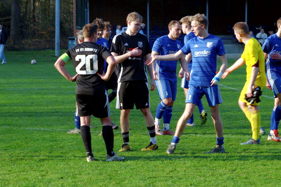 Fazit: Betretene Gesichter beim TV 01. Über weite Strecken desolate Bohmter kassieren den nächsten, dicken Dämpfer im Aufstiegsrennen, und das in der Höhe auch vollkommen verdient. Ungewöhnlich viele, individuelle Fehler, eine Menge Ungenauigkeiten im kaum messbaren Aufbauspiel und irgendwie fehlende, physische Power dagegenzuhalten sorgen für eine auch in der Höhe völlig verdiente Niederlage der Wittlager, die sich sicherlich nicht darüber hätten beschweren können, noch das eine oder andere Gegentor mehr zu kassieren. So wird das nichts mit dem Thema Bezirksliga, Bohmte sollte dringend nochmal alles auf Null stellen, und sich neu für den Aufstiegskampf fokussieren. Der Druck der 3 Teams dahinter wird unerbittlich sein. Chapeau an die Gastgeber, die sich mittlerweile zurecht auf Platz 5 vorgearbeitet haben, für eine couragierte und kampfstarke Leistung von der ersten bis zur letzten Minute. In der heutigen Verfassung ist es der Meyer-Elf durchaus zuzutrauen, dem einen oder anderen Topteam ebenfalls noch ein Bein zu stellen.