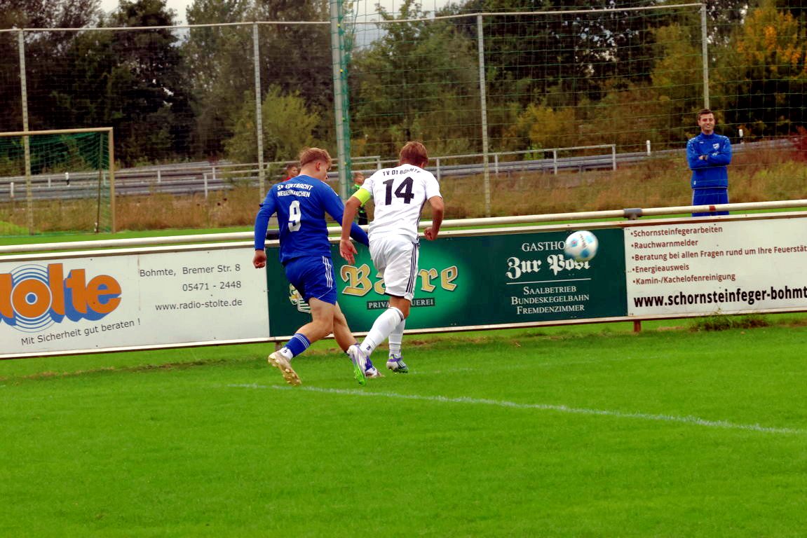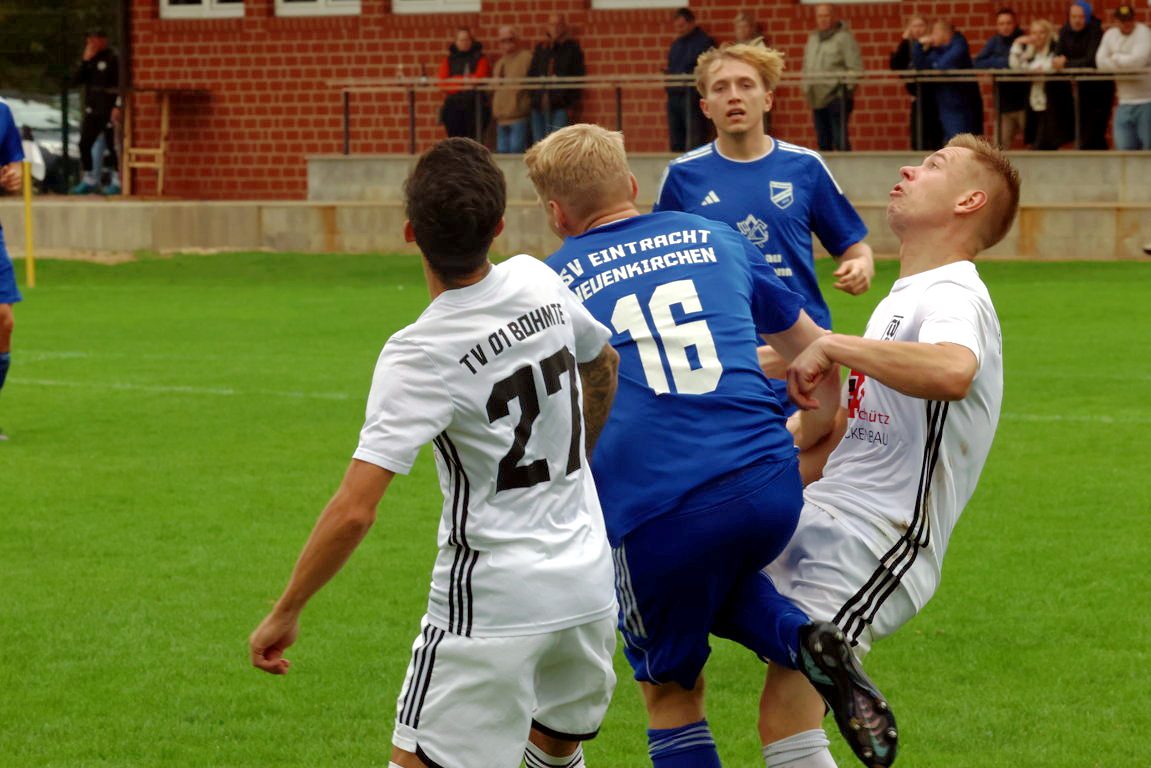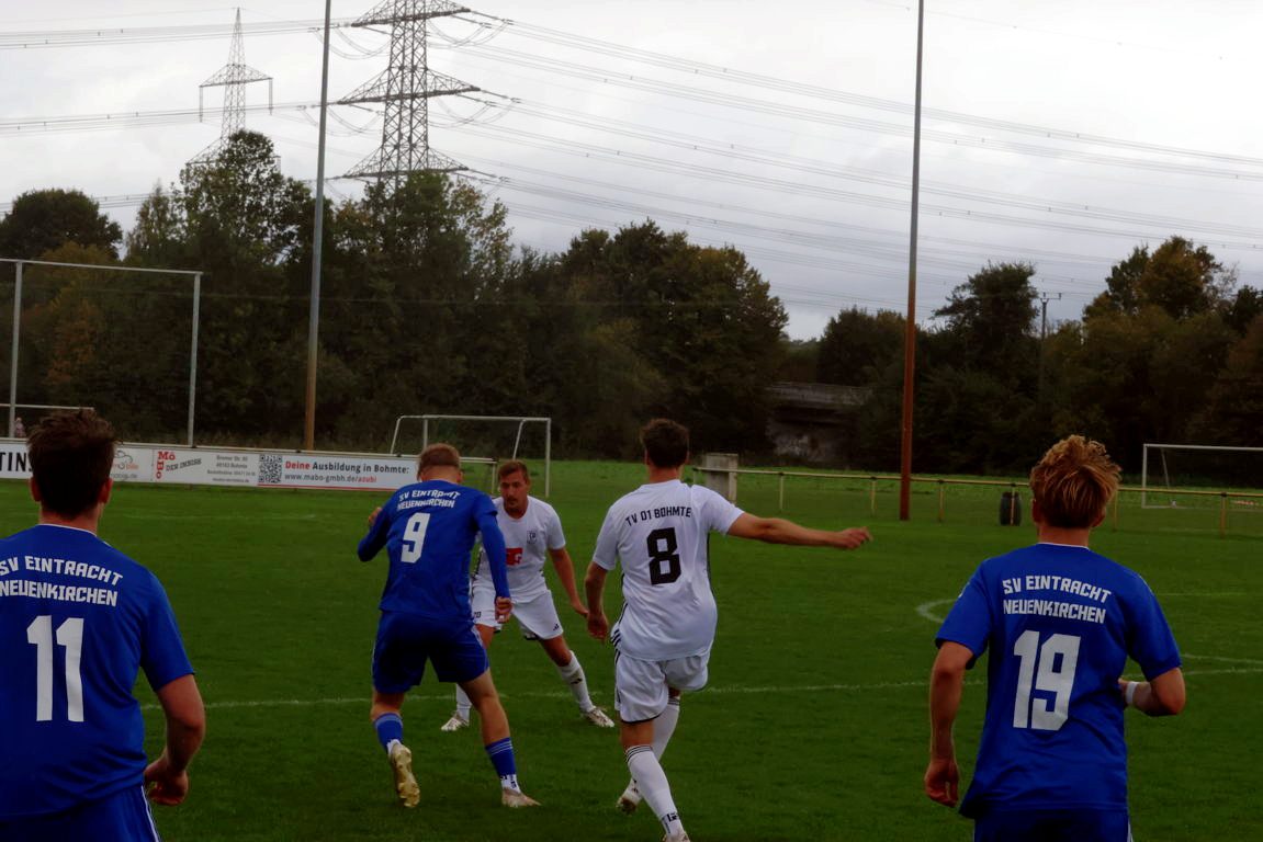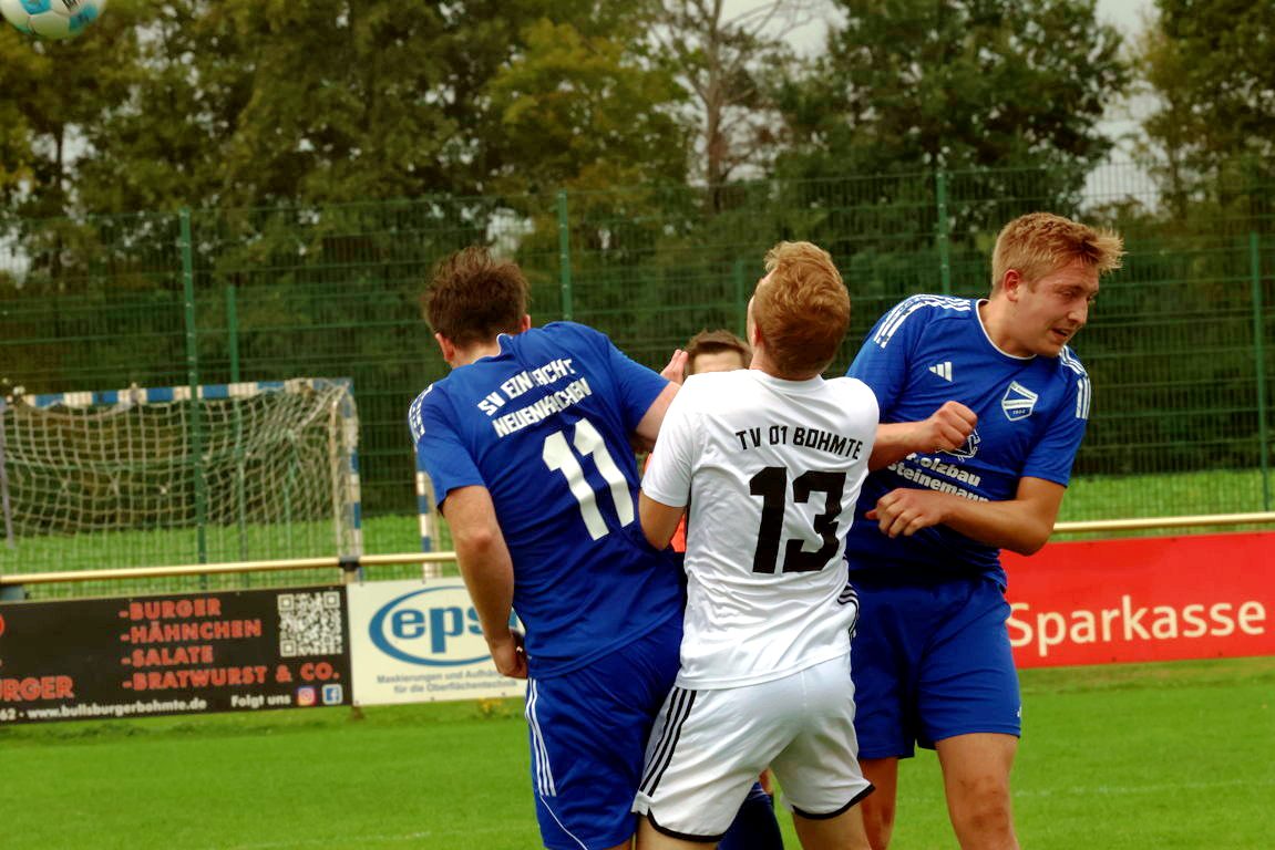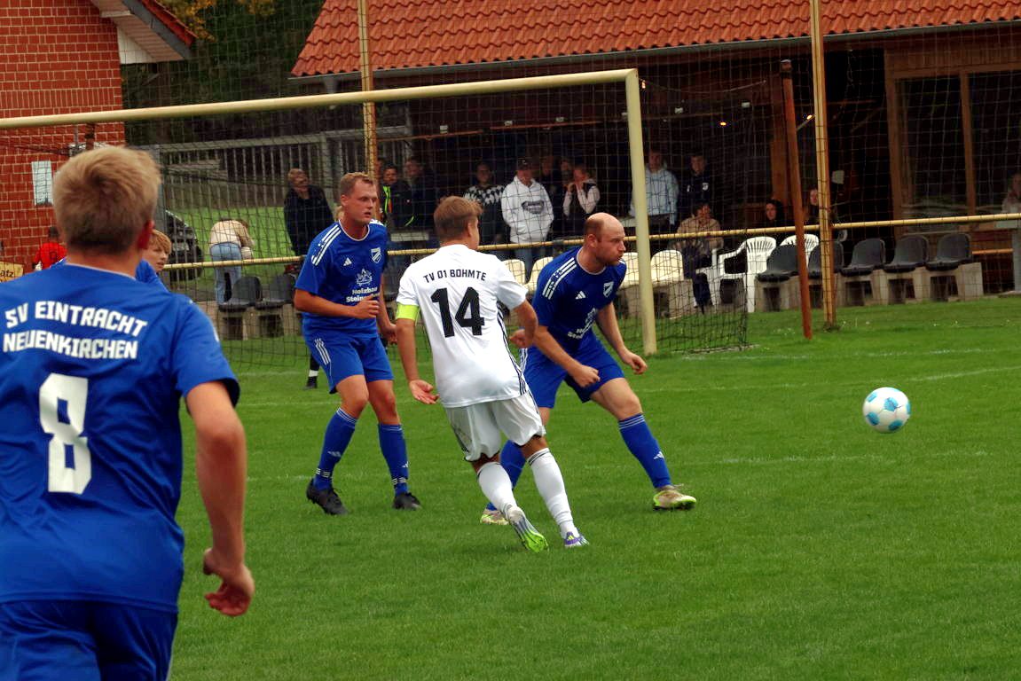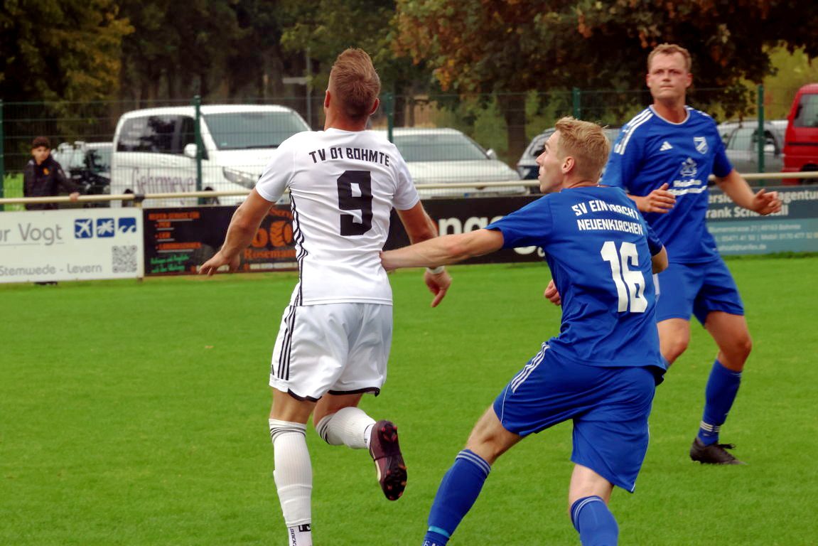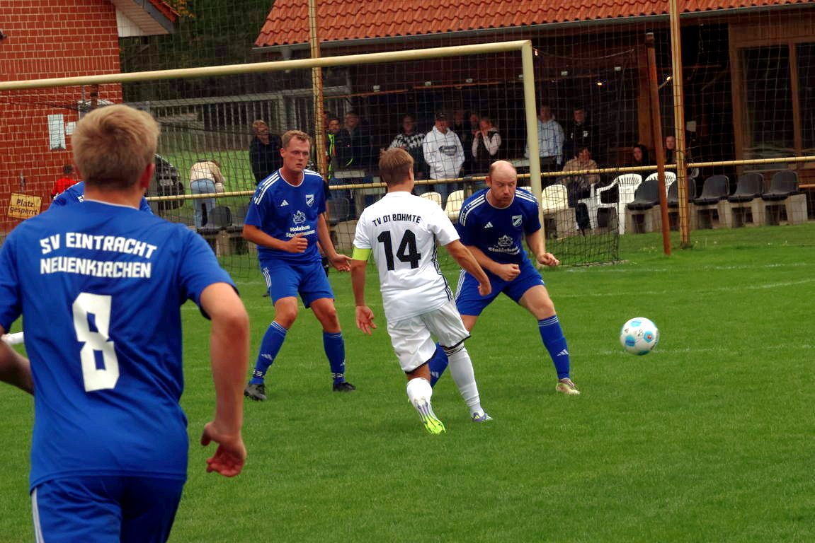 Bohmte von Beginn an mit einer äußerst stabilen Defensive aktiv, die über die gesamte Spielzeit hinweg wenig bis kaum Zwingendes seitens des Bezirksliga-Absteigers zuließ. So konnte man gestützt darauf auch ziemlich zügig die gewohnte Offensiv-Power entfalten. So waren 9 Zeigerumdrehungen rum, da führte der TV 01 mit 1:0. Stani Kolb wurde aus der Zentrale von Luca Oevermann in den Strafraum bedient, schirmte die Kugel gut gegen die Verteidiger ab, und traf aus 8m überlegt halbrechts rein. 1 Minute später war der Doppelschlag der Gastgeber perfekt, es fiel das 2:0. Darüber scheiden sich noch etwas die Geister. Schiedsrichter Luca Knuth wertete dies als Eigentor von Lars Steinemann, und trug es auch so in den Spielbericht ein. Doch aus der Wahrnehmung des Liveticker-Melders dieser Begegnung heraus, gleichzeitig auch Autor dieser Zeilen, trug sich dieser Treffer folgendermaßen zu. Bastian Treseler wühlte sich in den Strafraum, wollte eigentlich quer ablegen auf Stani Kolb, der, in dieser Situation bedrängt von Lars Steinemann, aber nur ungewollt seine Fußspitze irgendwie noch an den Ball bekam. Dadurch bekam die Kugel eine ganz seltsame Flugkurve, und senkte sich aus etwa 10m über SVE-Keeper Ole Langelage hinweg ins Netz. Nach Wahrnehmung des Schiedsrichters und dem einen oder anderen am Sportgelände sei Steinemann zuletzt am Ball gewesen, nach Wahrnehmung des Tickermelders und Autor dieser Zeilen, der nicht die allerschlechteste Sicht hatte, war es Kolbs Fußspitze, die den Ball ins Tor bugsierte. Beleg dafür auch der Jubel von Kolb Bruchteile von Sekunden nach dem Einschlag. Ob man nun also das Eigentor von Steinemann wertet, oder doch Kolb als Torschützen nennt ist sicherlich absolut müßig, hier von dieser Stelle aus sei Kolb der Treffer gutgeschrieben. Bedenklich in der Situation war halt nur, was bis zum Schreiben dieser Zeilen anhält, das ein bestimmtes TV 01-Mitglied meint, hinter dem Rücken des Melders, ohne diesen direkt anzusprechen, permanent dessen Ticker torpedieren/ändern zu müssen. Aber sei es drum. Bohmte hatte seinen Offensivmotor am Laufen, und Neuenkirchen wirkte überrascht, musste sich sammeln. In Minute 17 musste TW Langelage seinen Strafraum verlassen, um per Grätsche soeben noch vor Fabio Grelha klären zu können. Bis Minute 38 musste der TV 01 dann aber verletzungsbedingt 2x wechseln, in der Phase dürfte sich deswegen möglicherweise leichtes Grummeln im Lager der Bohmter breit gemacht haben. Zumal sich die Gäste nun sukzessive auch offensiv etwas in Fahrt gebracht hatten. Doch wie bereits erwähnt, der TV 01 gestattete dem SVE kaum bis gar nichts, summasummarum eine sehr gute Abwehrleistung der Bohmter. Aber eben auch in diese Phase aufkommender Gäste hinein, markierte Bohmte das 3:0. Querablage am Strafraum von Frederik Schulze-Zumkley auf Stani Kolb, der freistehend aus 18m zentral unhaltbar halbhoch links rein abzog. Schon so etwas wie eine Vorentscheidung? Für Bohmte würde es auf jeden Fall sicher wichtig sein, ohne Gegentreffer in die Pause zu kommen. Das würde das Geschehen in Durchgang 2 sicher vereinfachen. Und der TV 01, der noch die eine oder andere kleinere Möglichkeit besaß, schaffte es, spielte das 3:0 souverän und vorbildlich diszipliniert in die Halbzeit. Klare und auch hochverdiente Führung der Gastgeber zur Pause. Neuenkirchen bis vielleicht auf 1-2 Abschlüsse offensiv nicht wirklich zwingend und durchschlagskräftig. Mark Barrenpohl musste seinen Jungs in der Kabine kräftig den Kopf waschen, wollte der SVE hier noch was Zählbares aus Bohmte mitnehmen. Die Ackermann-Elf durfte jedoch, wie so manchesmal in der Vergangenheit, in Durchgang 2 nicht den Fehler machen, aufgrund eines vermeintlich sicheren Vorsprungs 1-2 Gänge zurückzuschalten. Dafür war das Ding hier dann doch noch etwas zu wackelig.