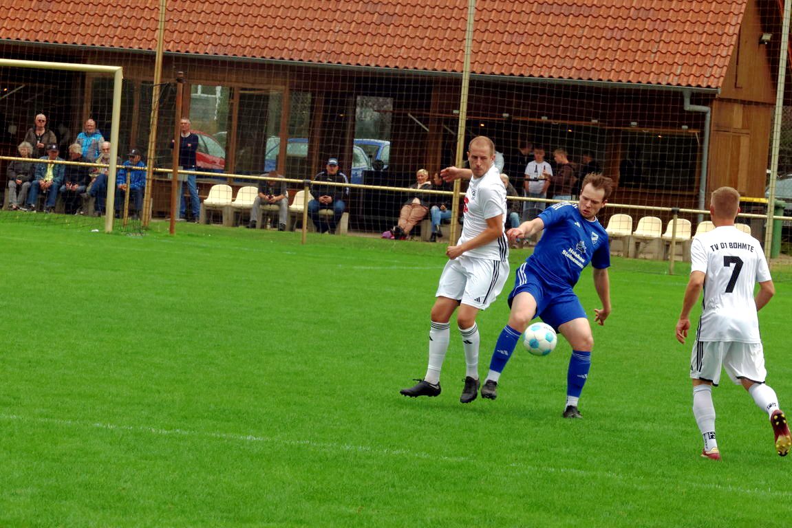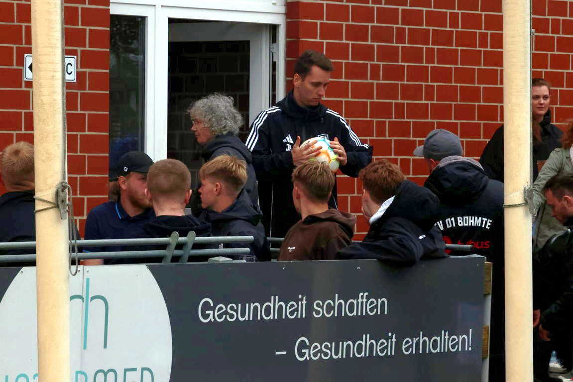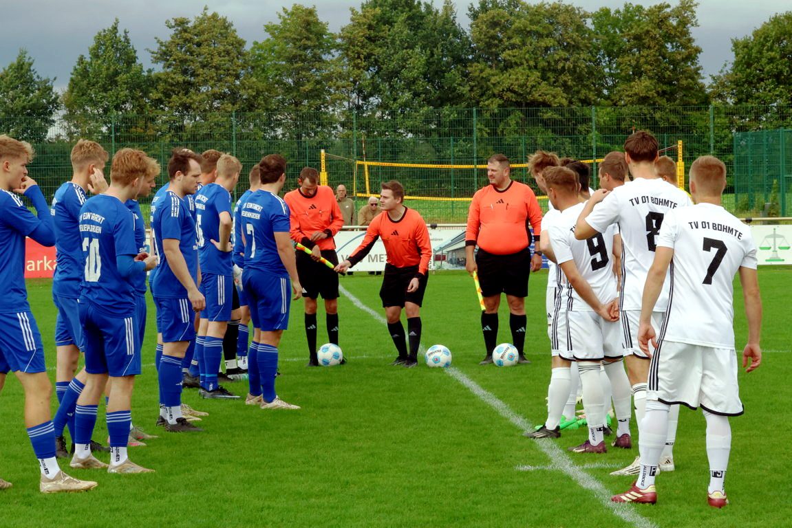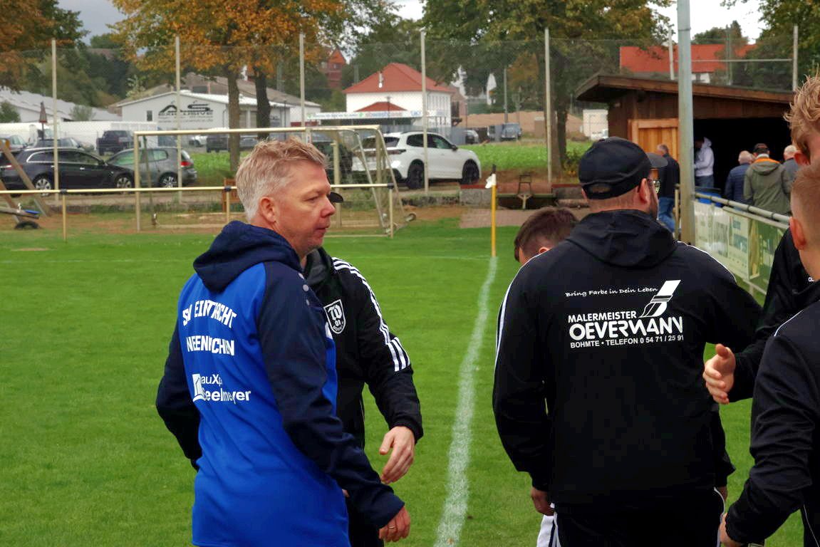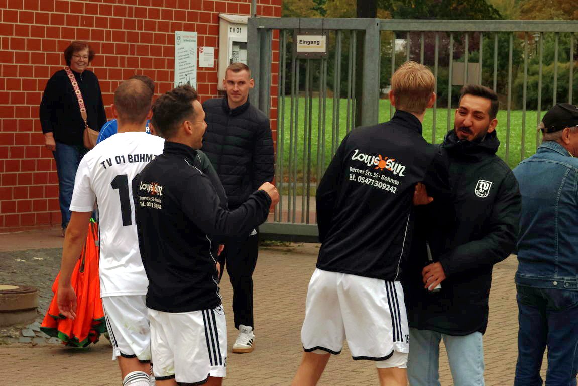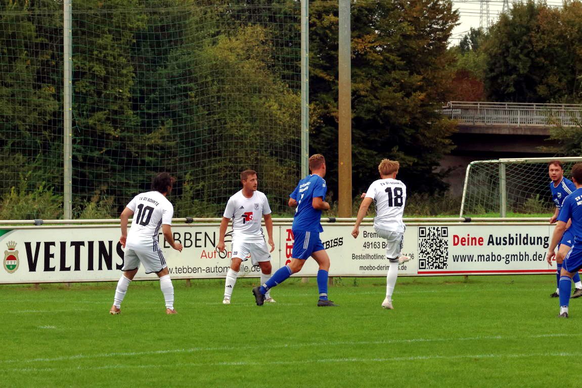 Bohmte von Beginn an mit einer äußerst stabilen Defensive aktiv, die über die gesamte Spielzeit hinweg wenig bis kaum Zwingendes seitens des Bezirksliga-Absteigers zuließ. So konnte man gestützt darauf auch ziemlich zügig die gewohnte Offensiv-Power entfalten. So waren 9 Zeigerumdrehungen rum, da führte der TV 01 mit 1:0. Stani Kolb wurde aus der Zentrale von Luca Oevermann in den Strafraum bedient, schirmte die Kugel gut gegen die Verteidiger ab, und traf aus 8m überlegt halbrechts rein. 1 Minute später war der Doppelschlag der Gastgeber perfekt, es fiel das 2:0. Darüber scheiden sich noch etwas die Geister. Schiedsrichter Luca Knuth wertete dies als Eigentor von Lars Steinemann, und trug es auch so in den Spielbericht ein. Doch aus der Wahrnehmung des Liveticker-Melders dieser Begegnung heraus, gleichzeitig auch Autor dieser Zeilen, trug sich dieser Treffer folgendermaßen zu. Bastian Treseler wühlte sich in den Strafraum, wollte eigentlich quer ablegen auf Stani Kolb, der, in dieser Situation bedrängt von Lars Steinemann, aber nur ungewollt seine Fußspitze irgendwie noch an den Ball bekam. Dadurch bekam die Kugel eine ganz seltsame Flugkurve, und senkte sich aus etwa 10m über SVE-Keeper Ole Langelage hinweg ins Netz. Nach Wahrnehmung des Schiedsrichters und dem einen oder anderen am Sportgelände sei Steinemann zuletzt am Ball gewesen, nach Wahrnehmung des Tickermelders und Autor dieser Zeilen, der nicht die allerschlechteste Sicht hatte, war es Kolbs Fußspitze, die den Ball ins Tor bugsierte. Beleg dafür auch der Jubel von Kolb Bruchteile von Sekunden nach dem Einschlag. Ob man nun also das Eigentor von Steinemann wertet, oder doch Kolb als Torschützen nennt ist sicherlich absolut müßig, hier von dieser Stelle aus sei Kolb der Treffer gutgeschrieben. Bedenklich in der Situation war halt nur, was bis zum Schreiben dieser Zeilen anhält, das ein bestimmtes TV 01-Mitglied meint, hinter dem Rücken des Melders, ohne diesen direkt anzusprechen, permanent dessen Ticker torpedieren/ändern zu müssen. Aber sei es drum. Bohmte hatte seinen Offensivmotor am Laufen, und Neuenkirchen wirkte überrascht, musste sich sammeln. In Minute 17 musste TW Langelage seinen Strafraum verlassen, um per Grätsche soeben noch vor Fabio Grelha klären zu können. Bis Minute 38 musste der TV 01 dann aber verletzungsbedingt 2x wechseln, in der Phase dürfte sich deswegen möglicherweise leichtes Grummeln im Lager der Bohmter breit gemacht haben. Zumal sich die Gäste nun sukzessive auch offensiv etwas in Fahrt gebracht hatten. Doch wie bereits erwähnt, der TV 01 gestattete dem SVE kaum bis gar nichts, summasummarum eine sehr gute Abwehrleistung der Bohmter. Aber eben auch in diese Phase aufkommender Gäste hinein, markierte Bohmte das 3:0. Querablage am Strafraum von Frederik Schulze-Zumkley auf Stani Kolb, der freistehend aus 18m zentral unhaltbar halbhoch links rein abzog. Schon so etwas wie eine Vorentscheidung? Für Bohmte würde es auf jeden Fall sicher wichtig sein, ohne Gegentreffer in die Pause zu kommen. Das würde das Geschehen in Durchgang 2 sicher vereinfachen. Und der TV 01, der noch die eine oder andere kleinere Möglichkeit besaß, schaffte es, spielte das 3:0 souverän und vorbildlich diszipliniert in die Halbzeit. Klare und auch hochverdiente Führung der Gastgeber zur Pause. Neuenkirchen bis vielleicht auf 1-2 Abschlüsse offensiv nicht wirklich zwingend und durchschlagskräftig. Mark Barrenpohl musste seinen Jungs in der Kabine kräftig den Kopf waschen, wollte der SVE hier noch was Zählbares aus Bohmte mitnehmen. Die Ackermann-Elf durfte jedoch, wie so manchesmal in der Vergangenheit, in Durchgang 2 nicht den Fehler machen, aufgrund eines vermeintlich sicheren Vorsprungs 1-2 Gänge zurückzuschalten. Dafür war das Ding hier dann doch noch etwas zu wackelig.