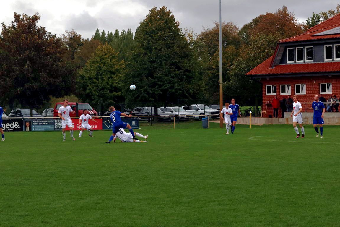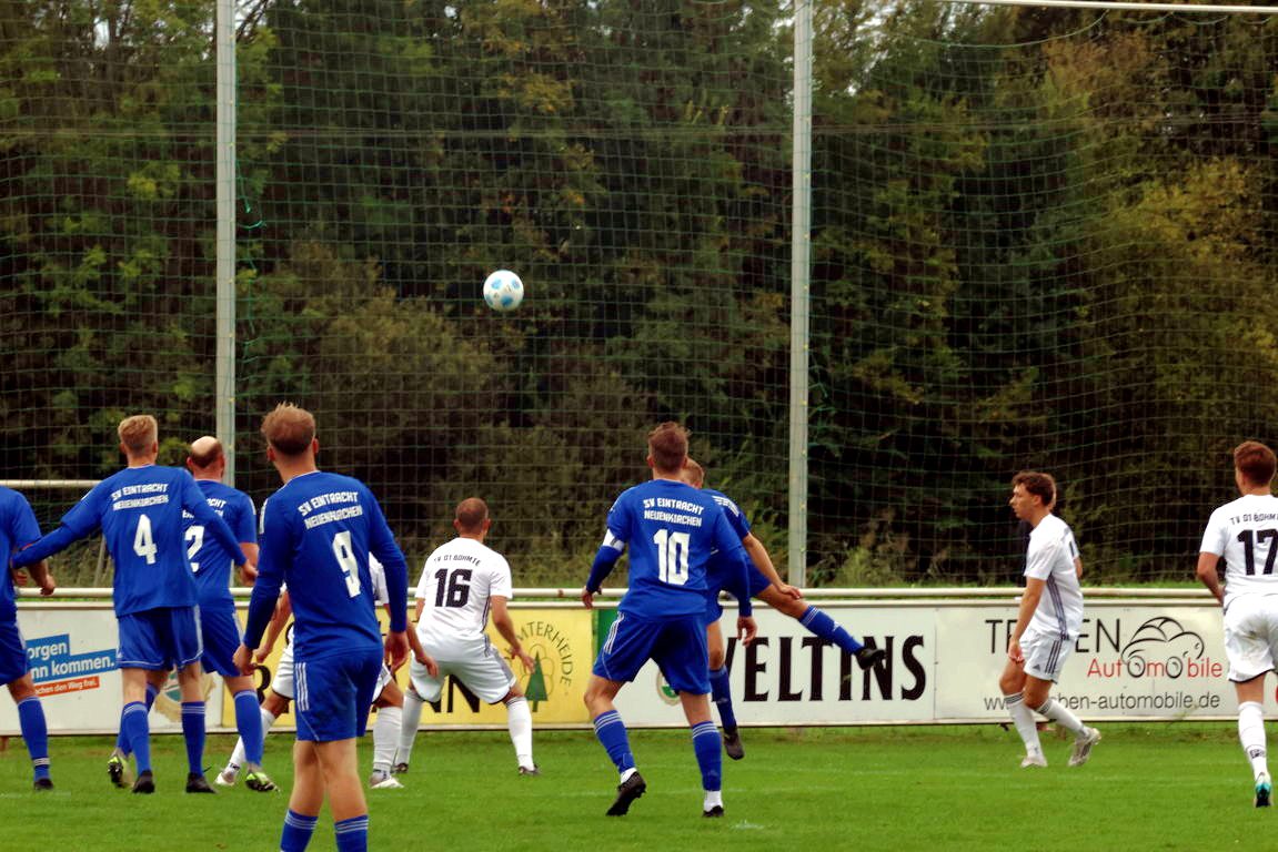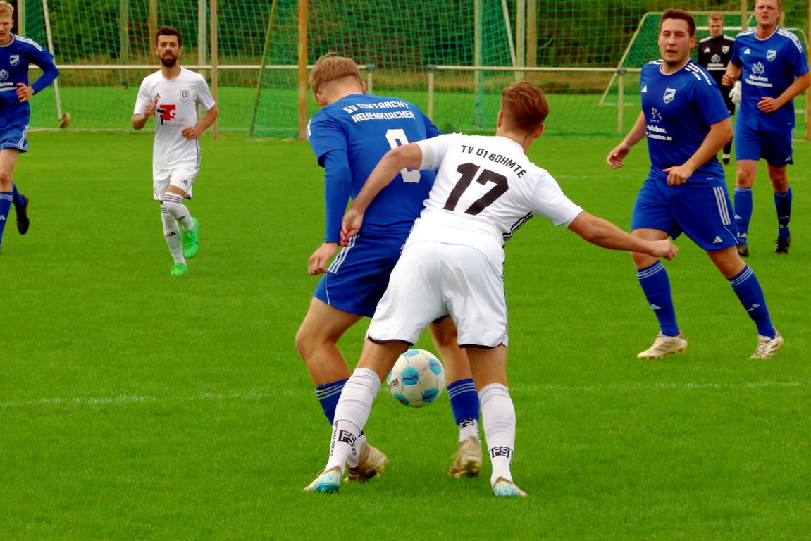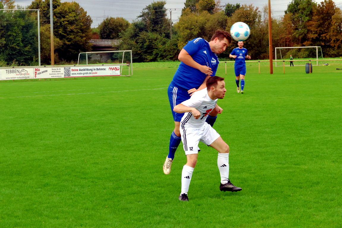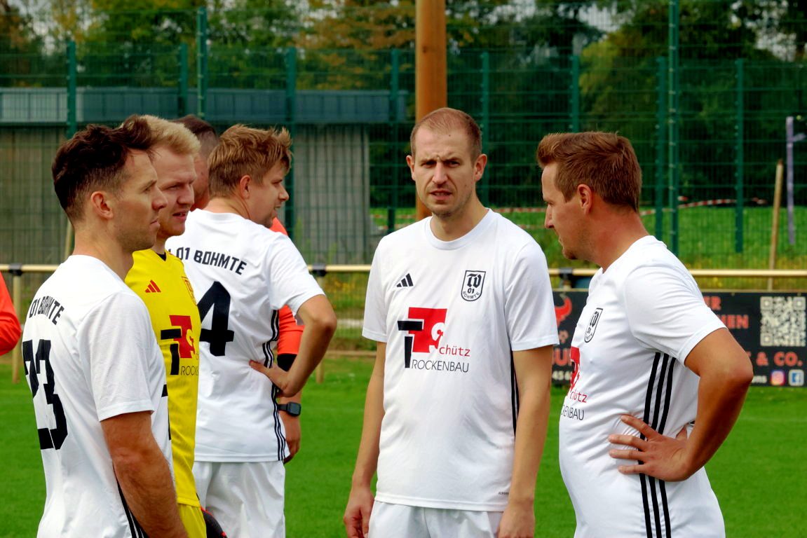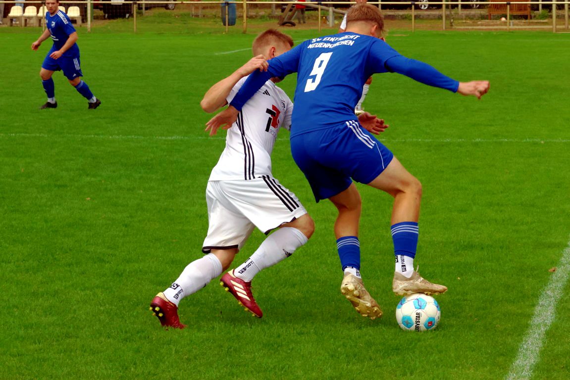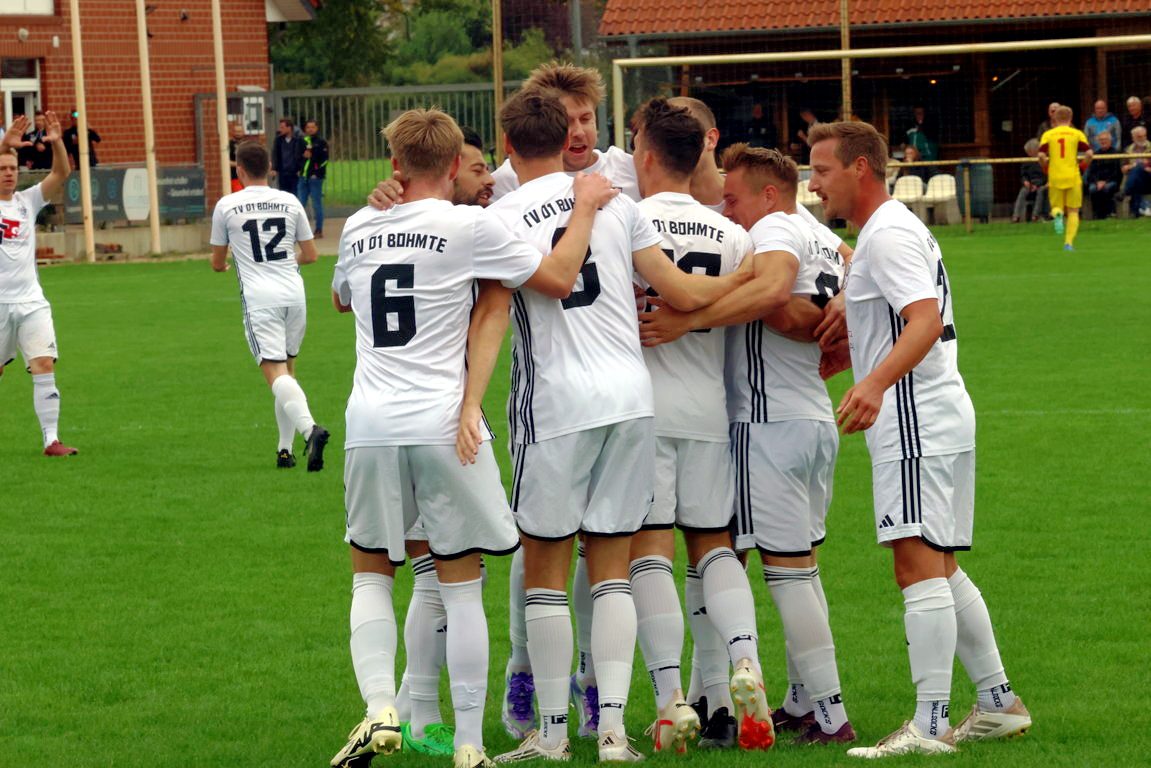 Bohmte von Beginn an mit einer äußerst stabilen Defensive aktiv, die über die gesamte Spielzeit hinweg wenig bis kaum Zwingendes seitens des Bezirksliga-Absteigers zuließ. So konnte man gestützt darauf auch ziemlich zügig die gewohnte Offensiv-Power entfalten. So waren 9 Zeigerumdrehungen rum, da führte der TV 01 mit 1:0. Stani Kolb wurde aus der Zentrale von Luca Oevermann in den Strafraum bedient, schirmte die Kugel gut gegen die Verteidiger ab, und traf aus 8m überlegt halbrechts rein. 1 Minute später war der Doppelschlag der Gastgeber perfekt, es fiel das 2:0. Darüber scheiden sich noch etwas die Geister. Schiedsrichter Luca Knuth wertete dies als Eigentor von Lars Steinemann, und trug es auch so in den Spielbericht ein. Doch aus der Wahrnehmung des Liveticker-Melders dieser Begegnung heraus, gleichzeitig auch Autor dieser Zeilen, trug sich dieser Treffer folgendermaßen zu. Bastian Treseler wühlte sich in den Strafraum, wollte eigentlich quer ablegen auf Stani Kolb, der, in dieser Situation bedrängt von Lars Steinemann, aber nur ungewollt seine Fußspitze irgendwie noch an den Ball bekam. Dadurch bekam die Kugel eine ganz seltsame Flugkurve, und senkte sich aus etwa 10m über SVE-Keeper Ole Langelage hinweg ins Netz. Nach Wahrnehmung des Schiedsrichters und dem einen oder anderen am Sportgelände sei Steinemann zuletzt am Ball gewesen, nach Wahrnehmung des Tickermelders und Autor dieser Zeilen, der nicht die allerschlechteste Sicht hatte, war es Kolbs Fußspitze, die den Ball ins Tor bugsierte. Beleg dafür auch der Jubel von Kolb Bruchteile von Sekunden nach dem Einschlag. Ob man nun also das Eigentor von Steinemann wertet, oder doch Kolb als Torschützen nennt ist sicherlich absolut müßig, hier von dieser Stelle aus sei Kolb der Treffer gutgeschrieben. Bedenklich in der Situation war halt nur, was bis zum Schreiben dieser Zeilen anhält, das ein bestimmtes TV 01-Mitglied meint, hinter dem Rücken des Melders, ohne diesen direkt anzusprechen, permanent dessen Ticker torpedieren/ändern zu müssen. Aber sei es drum. Bohmte hatte seinen Offensivmotor am Laufen, und Neuenkirchen wirkte überrascht, musste sich sammeln. In Minute 17 musste TW Langelage seinen Strafraum verlassen, um per Grätsche soeben noch vor Fabio Grelha klären zu können. Bis Minute 38 musste der TV 01 dann aber verletzungsbedingt 2x wechseln, in der Phase dürfte sich deswegen möglicherweise leichtes Grummeln im Lager der Bohmter breit gemacht haben. Zumal sich die Gäste nun sukzessive auch offensiv etwas in Fahrt gebracht hatten. Doch wie bereits erwähnt, der TV 01 gestattete dem SVE kaum bis gar nichts, summasummarum eine sehr gute Abwehrleistung der Bohmter. Aber eben auch in diese Phase aufkommender Gäste hinein, markierte Bohmte das 3:0. Querablage am Strafraum von Frederik Schulze-Zumkley auf Stani Kolb, der freistehend aus 18m zentral unhaltbar halbhoch links rein abzog. Schon so etwas wie eine Vorentscheidung? Für Bohmte würde es auf jeden Fall sicher wichtig sein, ohne Gegentreffer in die Pause zu kommen. Das würde das Geschehen in Durchgang 2 sicher vereinfachen. Und der TV 01, der noch die eine oder andere kleinere Möglichkeit besaß, schaffte es, spielte das 3:0 souverän und vorbildlich diszipliniert in die Halbzeit. Klare und auch hochverdiente Führung der Gastgeber zur Pause. Neuenkirchen bis vielleicht auf 1-2 Abschlüsse offensiv nicht wirklich zwingend und durchschlagskräftig. Mark Barrenpohl musste seinen Jungs in der Kabine kräftig den Kopf waschen, wollte der SVE hier noch was Zählbares aus Bohmte mitnehmen. Die Ackermann-Elf durfte jedoch, wie so manchesmal in der Vergangenheit, in Durchgang 2 nicht den Fehler machen, aufgrund eines vermeintlich sicheren Vorsprungs 1-2 Gänge zurückzuschalten. Dafür war das Ding hier dann doch noch etwas zu wackelig.