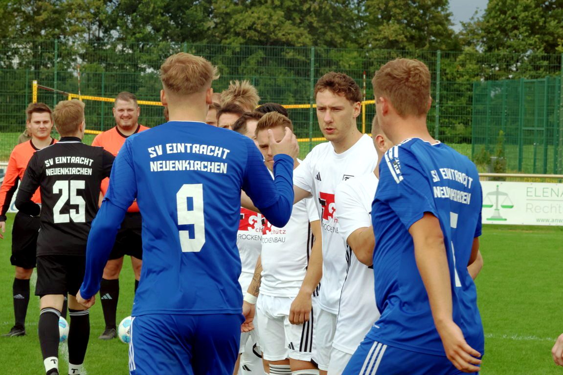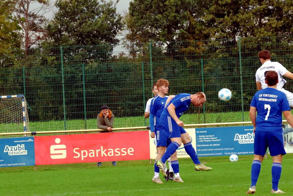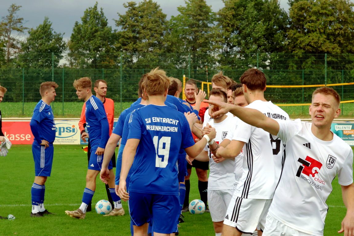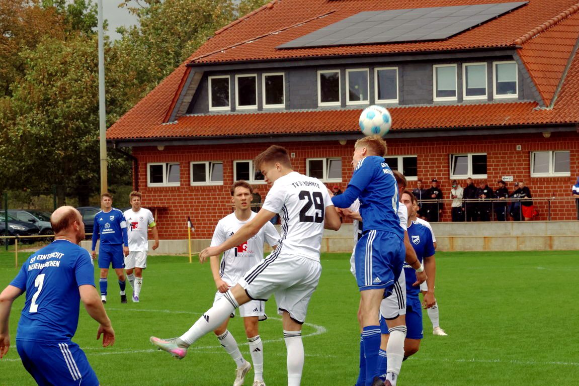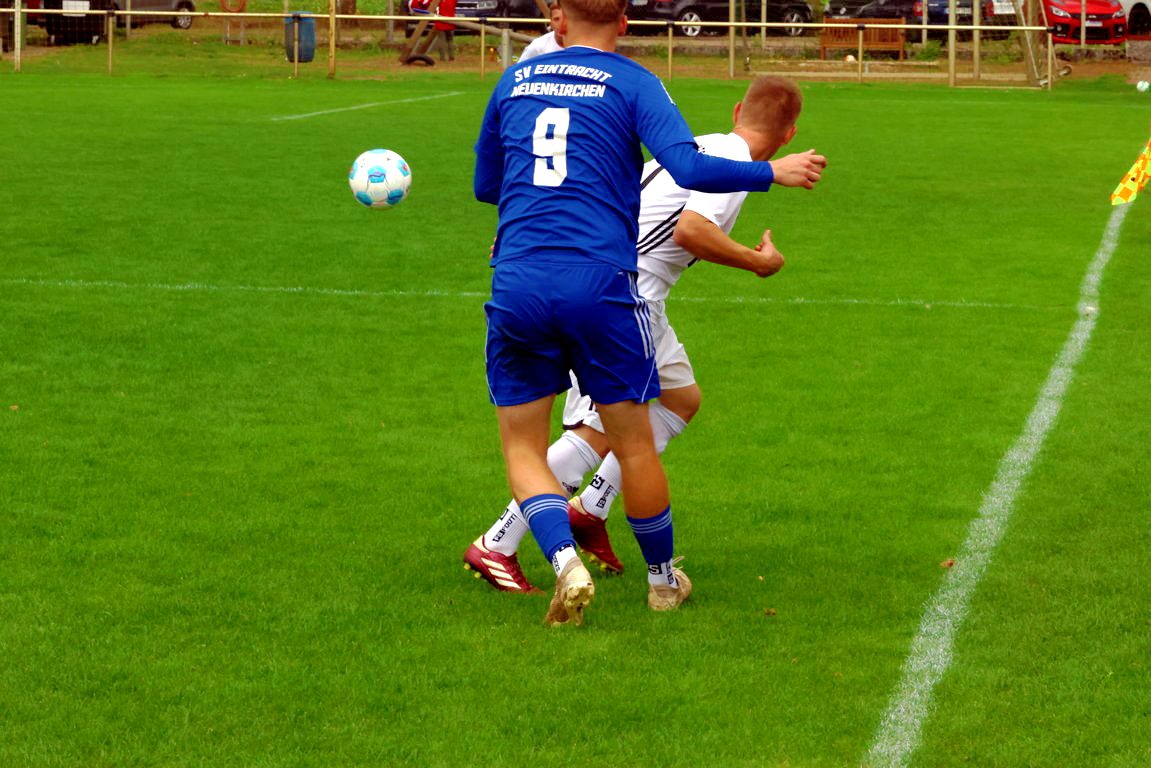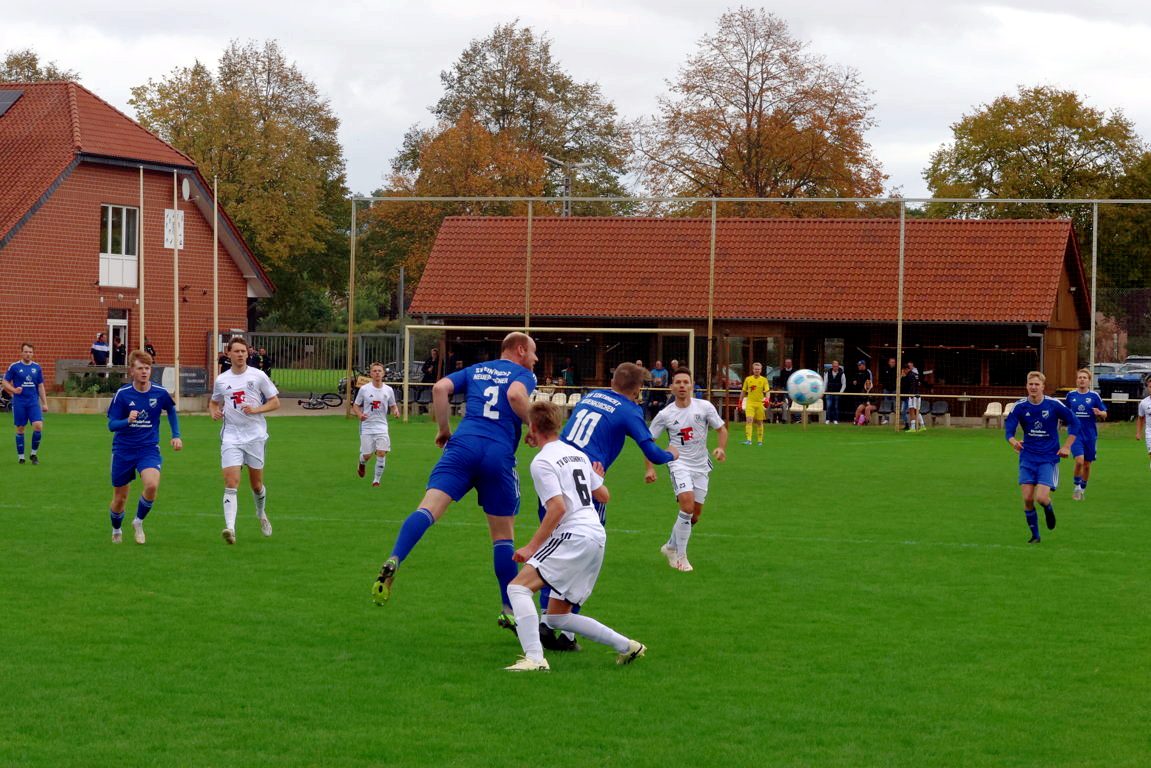 Bohmte von Beginn an mit einer äußerst stabilen Defensive aktiv, die über die gesamte Spielzeit hinweg wenig bis kaum Zwingendes seitens des Bezirksliga-Absteigers zuließ. So konnte man gestützt darauf auch ziemlich zügig die gewohnte Offensiv-Power entfalten. So waren 9 Zeigerumdrehungen rum, da führte der TV 01 mit 1:0. Stani Kolb wurde aus der Zentrale von Luca Oevermann in den Strafraum bedient, schirmte die Kugel gut gegen die Verteidiger ab, und traf aus 8m überlegt halbrechts rein. 1 Minute später war der Doppelschlag der Gastgeber perfekt, es fiel das 2:0. Darüber scheiden sich noch etwas die Geister. Schiedsrichter Luca Knuth wertete dies als Eigentor von Lars Steinemann, und trug es auch so in den Spielbericht ein. Doch aus der Wahrnehmung des Liveticker-Melders dieser Begegnung heraus, gleichzeitig auch Autor dieser Zeilen, trug sich dieser Treffer folgendermaßen zu. Bastian Treseler wühlte sich in den Strafraum, wollte eigentlich quer ablegen auf Stani Kolb, der, in dieser Situation bedrängt von Lars Steinemann, aber nur ungewollt seine Fußspitze irgendwie noch an den Ball bekam. Dadurch bekam die Kugel eine ganz seltsame Flugkurve, und senkte sich aus etwa 10m über SVE-Keeper Ole Langelage hinweg ins Netz. Nach Wahrnehmung des Schiedsrichters und dem einen oder anderen am Sportgelände sei Steinemann zuletzt am Ball gewesen, nach Wahrnehmung des Tickermelders und Autor dieser Zeilen, der nicht die allerschlechteste Sicht hatte, war es Kolbs Fußspitze, die den Ball ins Tor bugsierte. Beleg dafür auch der Jubel von Kolb Bruchteile von Sekunden nach dem Einschlag. Ob man nun also das Eigentor von Steinemann wertet, oder doch Kolb als Torschützen nennt ist sicherlich absolut müßig, hier von dieser Stelle aus sei Kolb der Treffer gutgeschrieben. Bedenklich in der Situation war halt nur, was bis zum Schreiben dieser Zeilen anhält, das ein bestimmtes TV 01-Mitglied meint, hinter dem Rücken des Melders, ohne diesen direkt anzusprechen, permanent dessen Ticker torpedieren/ändern zu müssen. Aber sei es drum. Bohmte hatte seinen Offensivmotor am Laufen, und Neuenkirchen wirkte überrascht, musste sich sammeln. In Minute 17 musste TW Langelage seinen Strafraum verlassen, um per Grätsche soeben noch vor Fabio Grelha klären zu können. Bis Minute 38 musste der TV 01 dann aber verletzungsbedingt 2x wechseln, in der Phase dürfte sich deswegen möglicherweise leichtes Grummeln im Lager der Bohmter breit gemacht haben. Zumal sich die Gäste nun sukzessive auch offensiv etwas in Fahrt gebracht hatten. Doch wie bereits erwähnt, der TV 01 gestattete dem SVE kaum bis gar nichts, summasummarum eine sehr gute Abwehrleistung der Bohmter. Aber eben auch in diese Phase aufkommender Gäste hinein, markierte Bohmte das 3:0. Querablage am Strafraum von Frederik Schulze-Zumkley auf Stani Kolb, der freistehend aus 18m zentral unhaltbar halbhoch links rein abzog. Schon so etwas wie eine Vorentscheidung? Für Bohmte würde es auf jeden Fall sicher wichtig sein, ohne Gegentreffer in die Pause zu kommen. Das würde das Geschehen in Durchgang 2 sicher vereinfachen. Und der TV 01, der noch die eine oder andere kleinere Möglichkeit besaß, schaffte es, spielte das 3:0 souverän und vorbildlich diszipliniert in die Halbzeit. Klare und auch hochverdiente Führung der Gastgeber zur Pause. Neuenkirchen bis vielleicht auf 1-2 Abschlüsse offensiv nicht wirklich zwingend und durchschlagskräftig. Mark Barrenpohl musste seinen Jungs in der Kabine kräftig den Kopf waschen, wollte der SVE hier noch was Zählbares aus Bohmte mitnehmen. Die Ackermann-Elf durfte jedoch, wie so manchesmal in der Vergangenheit, in Durchgang 2 nicht den Fehler machen, aufgrund eines vermeintlich sicheren Vorsprungs 1-2 Gänge zurückzuschalten. Dafür war das Ding hier dann doch noch etwas zu wackelig.