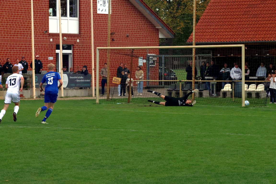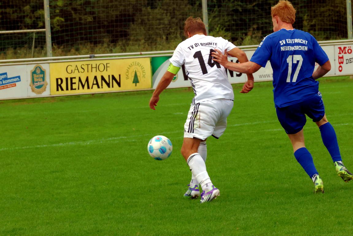 Es sah auch zunächst nach weiterer Bohmter Offensiv-Power aus. Direkt nach Wiederbeginn verstolperte Frederik Schulze-Zumkley 2m vorm leeren SVE-Tor eine Großchance. Doch das sollte für lange Zeit die Letzte bleiben. 1 gefährlicher Abschluss noch für Neuenkirchen in Minute 52, dann wurde das Geschehen zunehmend hektischer und nickeliger. Beinahe permanent lag irgendjemand am Boden, und musste behandelt werden. Bohmte beschränkte sich fast ausschließlich nur noch auf den Beibehalt der defensiven Grundordnung, trat im Angriff selten nur noch in Erscheinung. Da die Abwehr aber weiter hervorragend ihre Arbeit machte, fiel das erneute Zurückschalten insgesamt um einen Gang aber nicht sonderlich ins Gewicht. So etwa eine Viertelstunde vor Schluss war u.a. auch deswegen eine Phase entstanden, wo ein Tor, egal auf welcher Seite, überhaupt nicht in der Luft lag. Bohmte ließ weiterhin wenig zu. Sogar Ex-Oberliga-Akteur (TuS Bersenbrück), Matthias Lührmann, war bislang überhaupt noch gar nicht zur Entfaltung gekommen. Definitiv war jetzt aber eins. Würde hier gar das 4:0 fallen, wäre das natürlich die entgültige Entscheidung gewesen. Im Weiteren versuchten beide Teams noch, durch viele, viele Wechsel, ihrem Spiel noch den gewünschten Esprit zu verleihen. Doch es tat sich weiter kaum etwas mehr. Bis 2 Minuten vor dem Ende der offiziellen Spielzeit. Der eingewechselte Aaron Kortemeyer zog mit viel Speed über links in den Strafraum, wurde am Strafraumeck klar gelegt. Klarer Fall, Strafstoß für den TV 01. Rene Frese schnappte sich den Ball, und traf mit viel Doppel-Wumms flach rechts unten rein. TW Langelage war zwar in der richtigen Ecke, aber das Leder war wie gesagt zu stramm und platziert geschossen, 4:0. Natürlich die entgültige Entscheidung, die Begegnung trudelte nun auch aus. Bohmte hatte sich souverän, hochverdient und deutlich durchgesetzt.