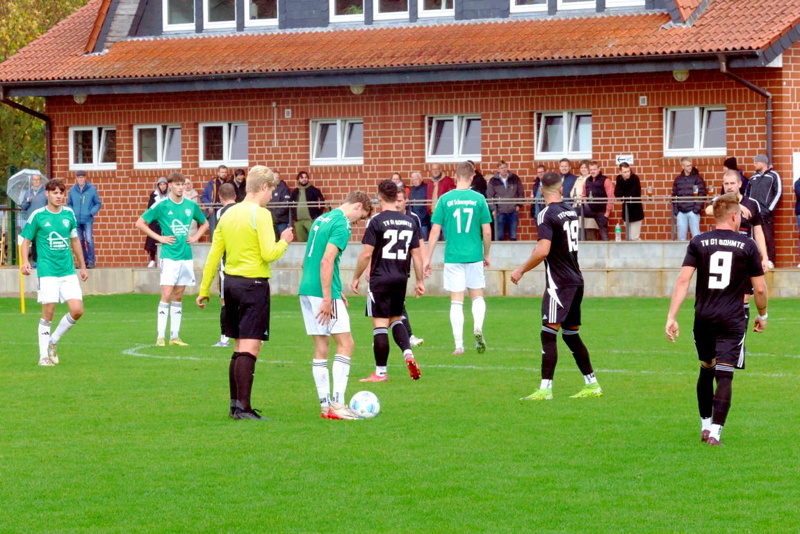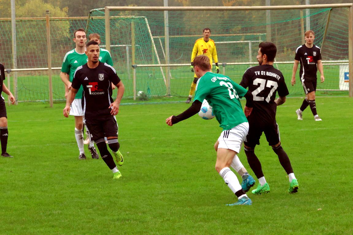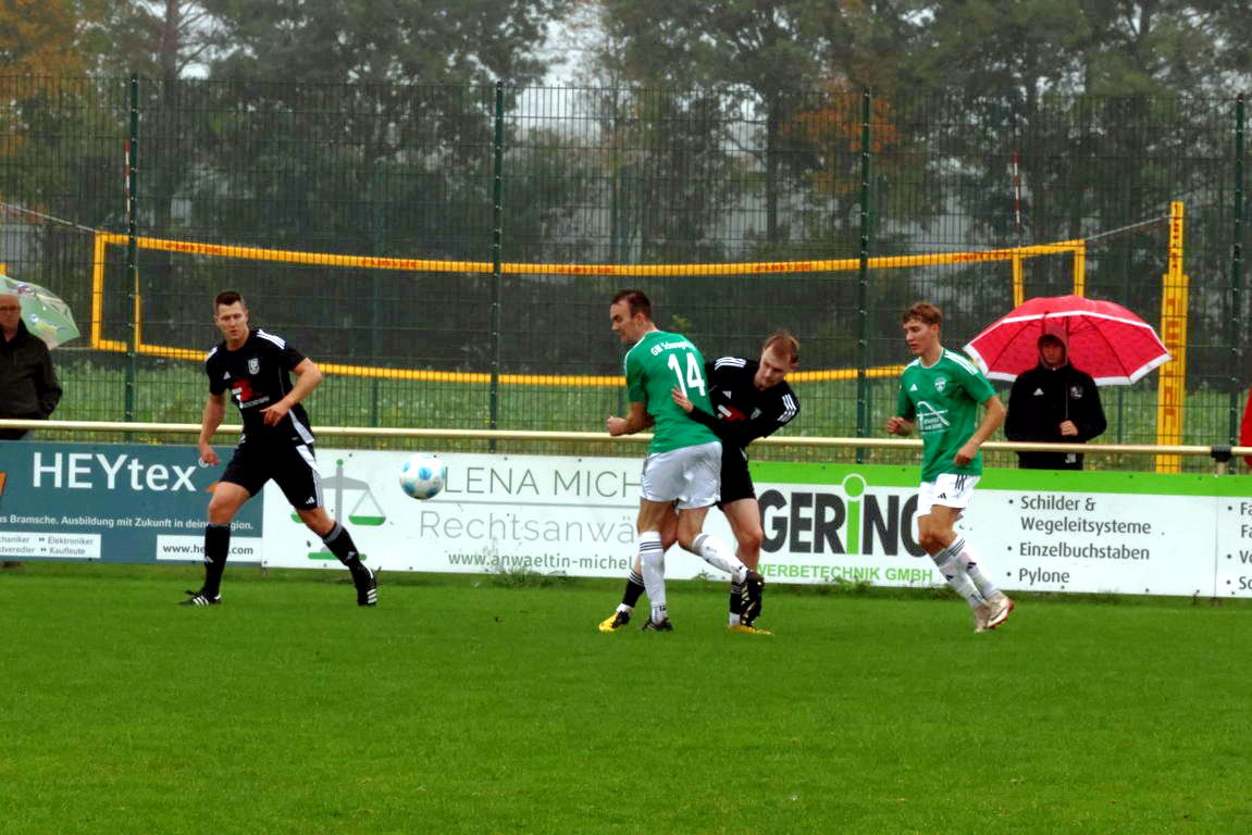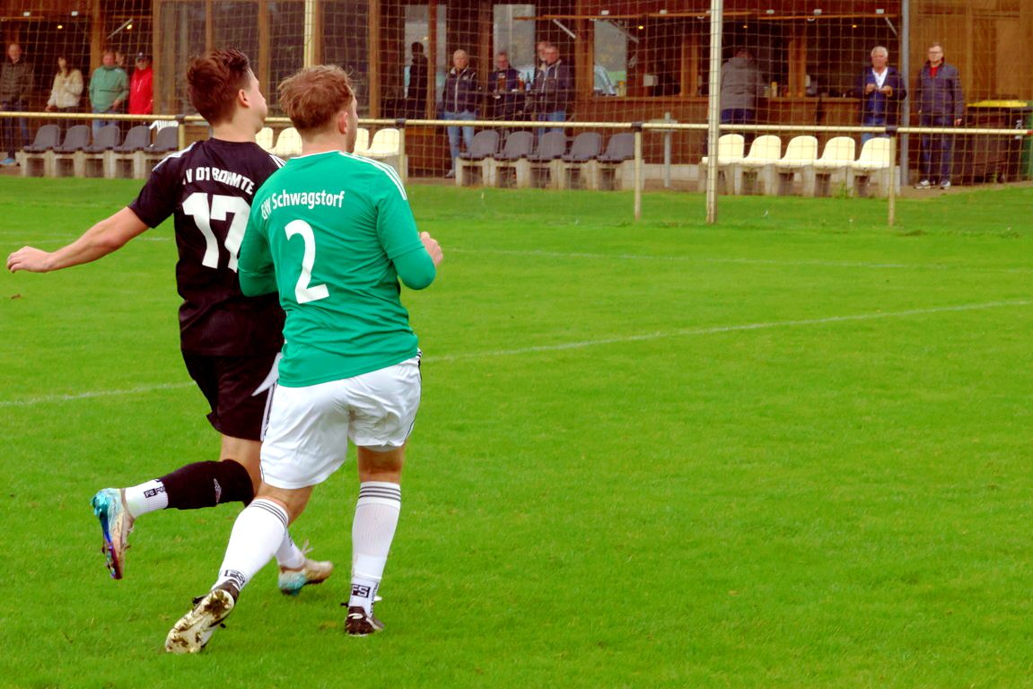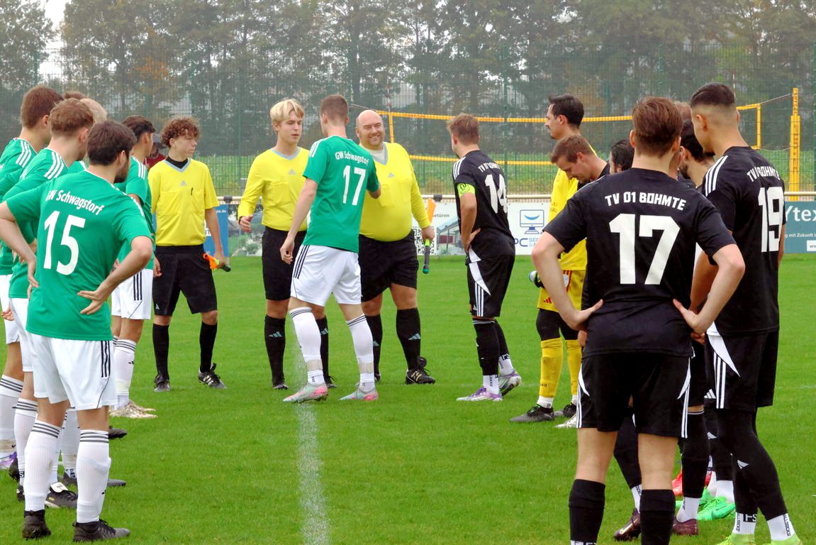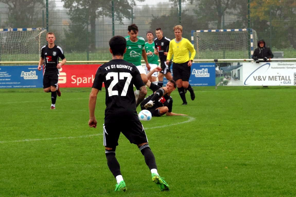 Bei ungemütlichem Nieselregen gingen die Protagonisten dieses Match an, doch die Gastgeber wirkten den kompletten 1. Durchgang irgendwie fahrig und uninspiriert. So hatte der Aufsteiger mit einer disziplinierten Abwehrleistung bis zum Halbzeitpfiff nullkommanull Probleme, den TV 01 zu verteidigen. Im Gegenteil, bei 2-3 Hochkarätern war zur Pause Schwagstorf dem 0:1 irgendwie näher, als Bohmte dem 1:0. Diese entstanden, weil Bohmte sich etwas wackelig präsentierte in der Abwehrarbeit. So entstand kein schönes Spiel auf der Ovelgönne, kein Team war so richtig im Vollgas-Modus, es war alles eher so ein Gewürge. Minute 16, perfekte flache Hereingabe von rechts, kurz vorm freistehenden Abschluss aus 8m zentral rutschte Jannik Wencker jedoch weg. Oder in Minute 25, erneut durch Jannik Wencker. Einen Abpraller nach Freistoß klärte TV 01-TW Bryan Bongiorno sensationell im 1 gegen 1 gegen eben Wencker. Ein Zufalls-Knaller von Rene Frese in Minute 36 aus 13m halbrechts blieb soweit der einzigste Abschluss der Gastgeber in Durchgang 1. So ertönte zeitnah der Halbzeitpfiff. Komplett zerfahrenes Spiel, hauptsächlich auf Seiten des TV 01. Die Gäste taten, was sie im Rahmen ihrer Möglichkeiten sicher können, nämlich diszipliniert verteidigen. Allerdings machte es ihnen ein bisher komplett einfallsloser Gastgeber auch relativ einfach. Für die Zuschauer war das Geschehen sicher nicht sehr schön anzuschauen bisher.