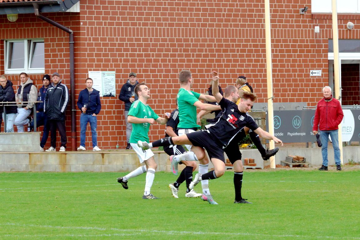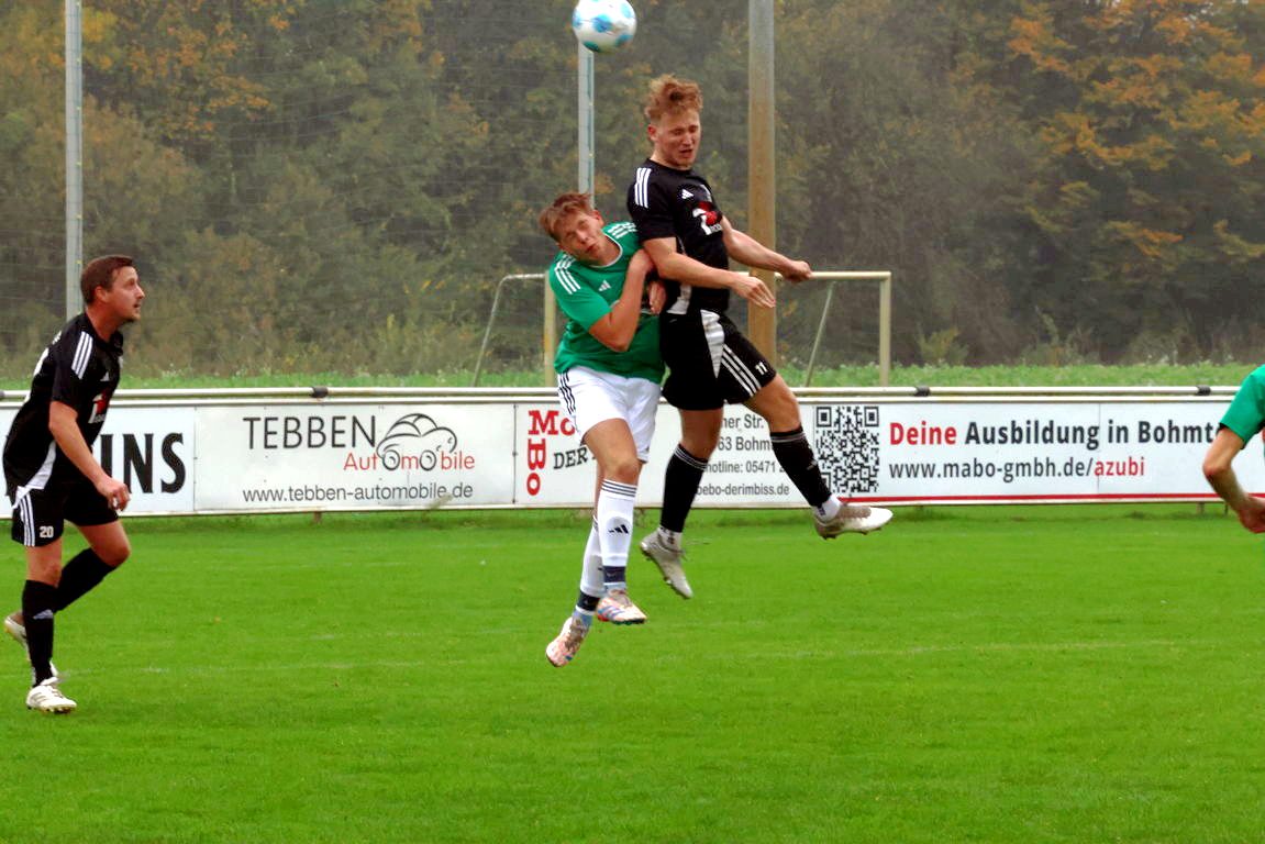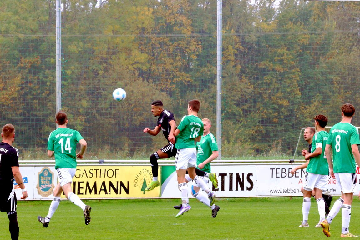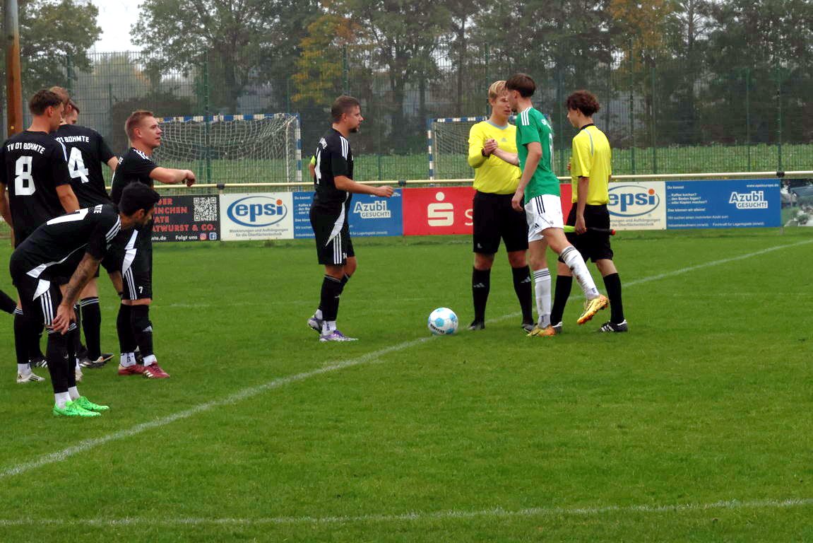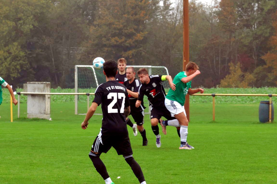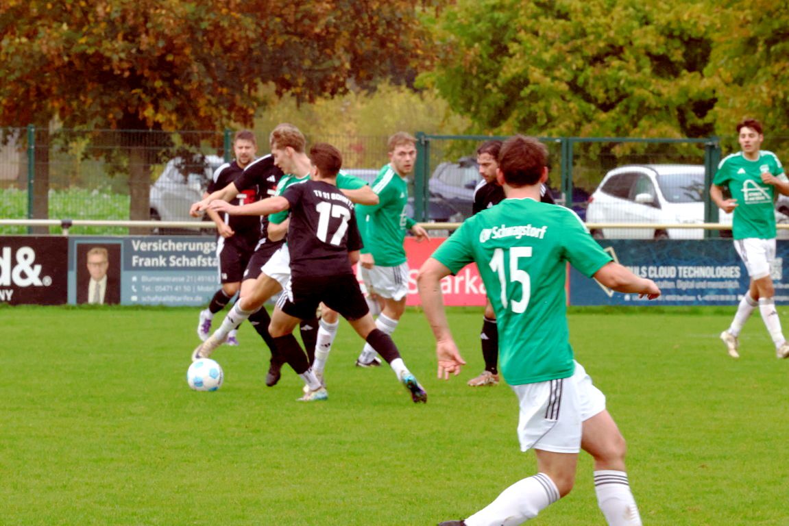 Bei ungemütlichem Nieselregen gingen die Protagonisten dieses Match an, doch die Gastgeber wirkten den kompletten 1. Durchgang irgendwie fahrig und uninspiriert. So hatte der Aufsteiger mit einer disziplinierten Abwehrleistung bis zum Halbzeitpfiff nullkommanull Probleme, den TV 01 zu verteidigen. Im Gegenteil, bei 2-3 Hochkarätern war zur Pause Schwagstorf dem 0:1 irgendwie näher, als Bohmte dem 1:0. Diese entstanden, weil Bohmte sich etwas wackelig präsentierte in der Abwehrarbeit. So entstand kein schönes Spiel auf der Ovelgönne, kein Team war so richtig im Vollgas-Modus, es war alles eher so ein Gewürge. Minute 16, perfekte flache Hereingabe von rechts, kurz vorm freistehenden Abschluss aus 8m zentral rutschte Jannik Wencker jedoch weg. Oder in Minute 25, erneut durch Jannik Wencker. Einen Abpraller nach Freistoß klärte TV 01-TW Bryan Bongiorno sensationell im 1 gegen 1 gegen eben Wencker. Ein Zufalls-Knaller von Rene Frese in Minute 36 aus 13m halbrechts blieb soweit der einzigste Abschluss der Gastgeber in Durchgang 1. So ertönte zeitnah der Halbzeitpfiff. Komplett zerfahrenes Spiel, hauptsächlich auf Seiten des TV 01. Die Gäste taten, was sie im Rahmen ihrer Möglichkeiten sicher können, nämlich diszipliniert verteidigen. Allerdings machte es ihnen ein bisher komplett einfallsloser Gastgeber auch relativ einfach. Für die Zuschauer war das Geschehen sicher nicht sehr schön anzuschauen bisher.